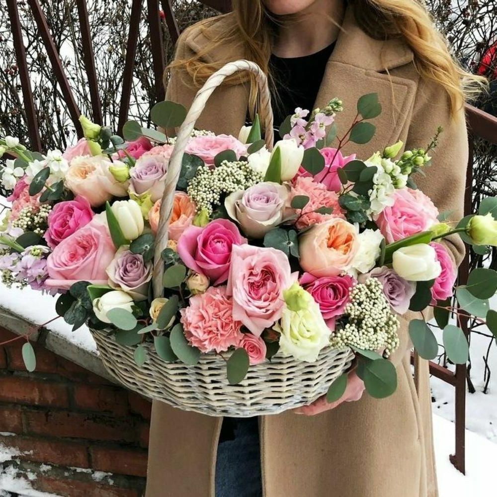 Корзина объединяет гортензии, эустомы, розы и маттиолу в многослойную композицию. Разные фактуры лепестков создают визуальную глубину и насыщенность.