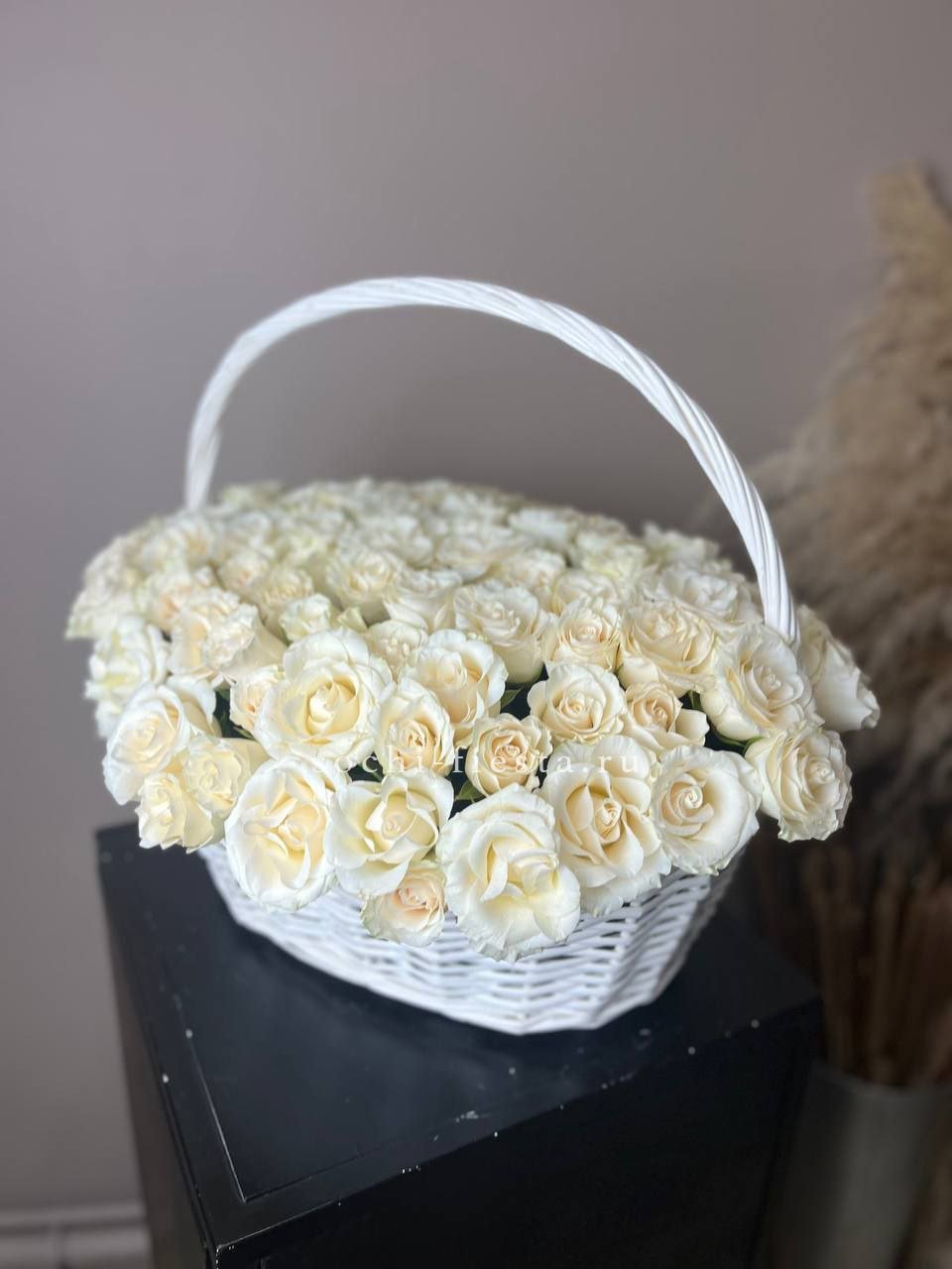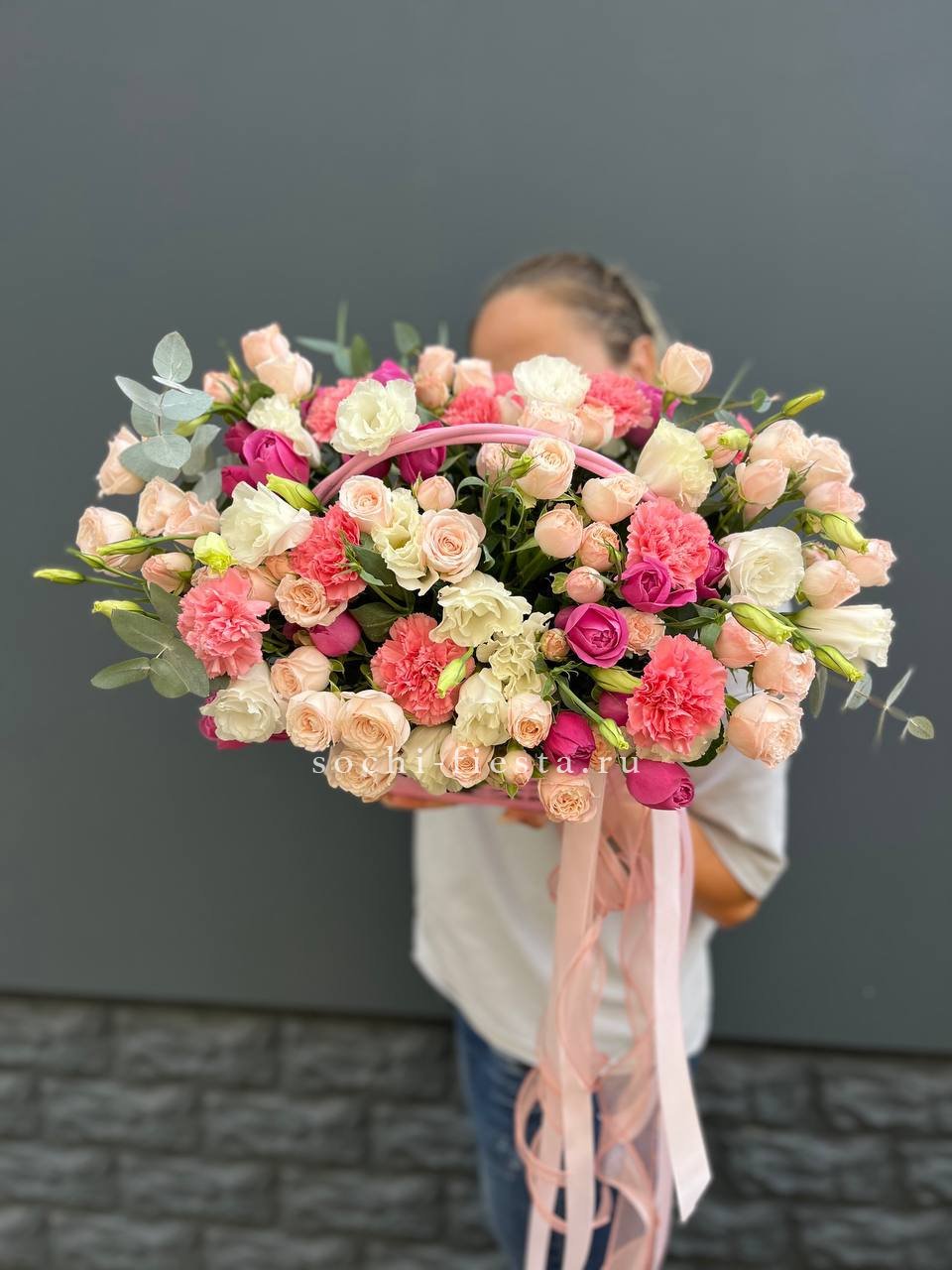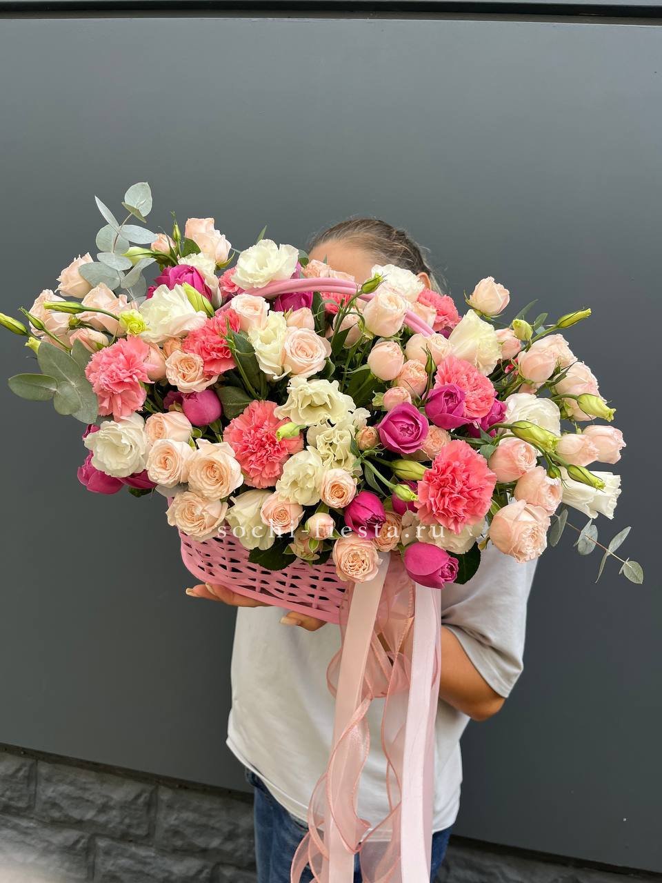 Пышная корзина с кустовыми розами и эустомой создает ощущение летнего изобилия. Диантусы добавляют воздушности между крупными бутонами, формируя объемную композицию. Готовое решение для яркого поздравления в удобной форме.