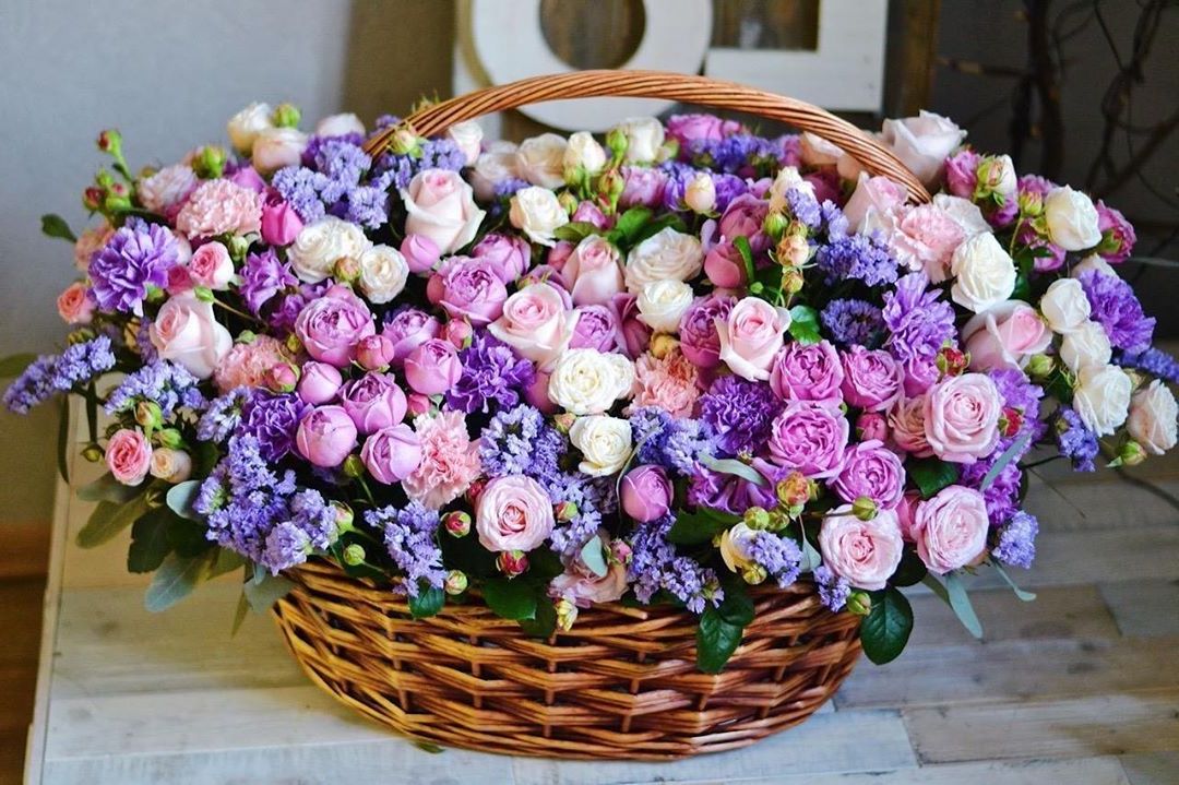 Плетёная корзина вмещает густую композицию из белых и розовых бутонов. Хризантемы и розы перемежаются с соцветиями гортензии, а статица добавляет воздушности между крупными головками цветов.