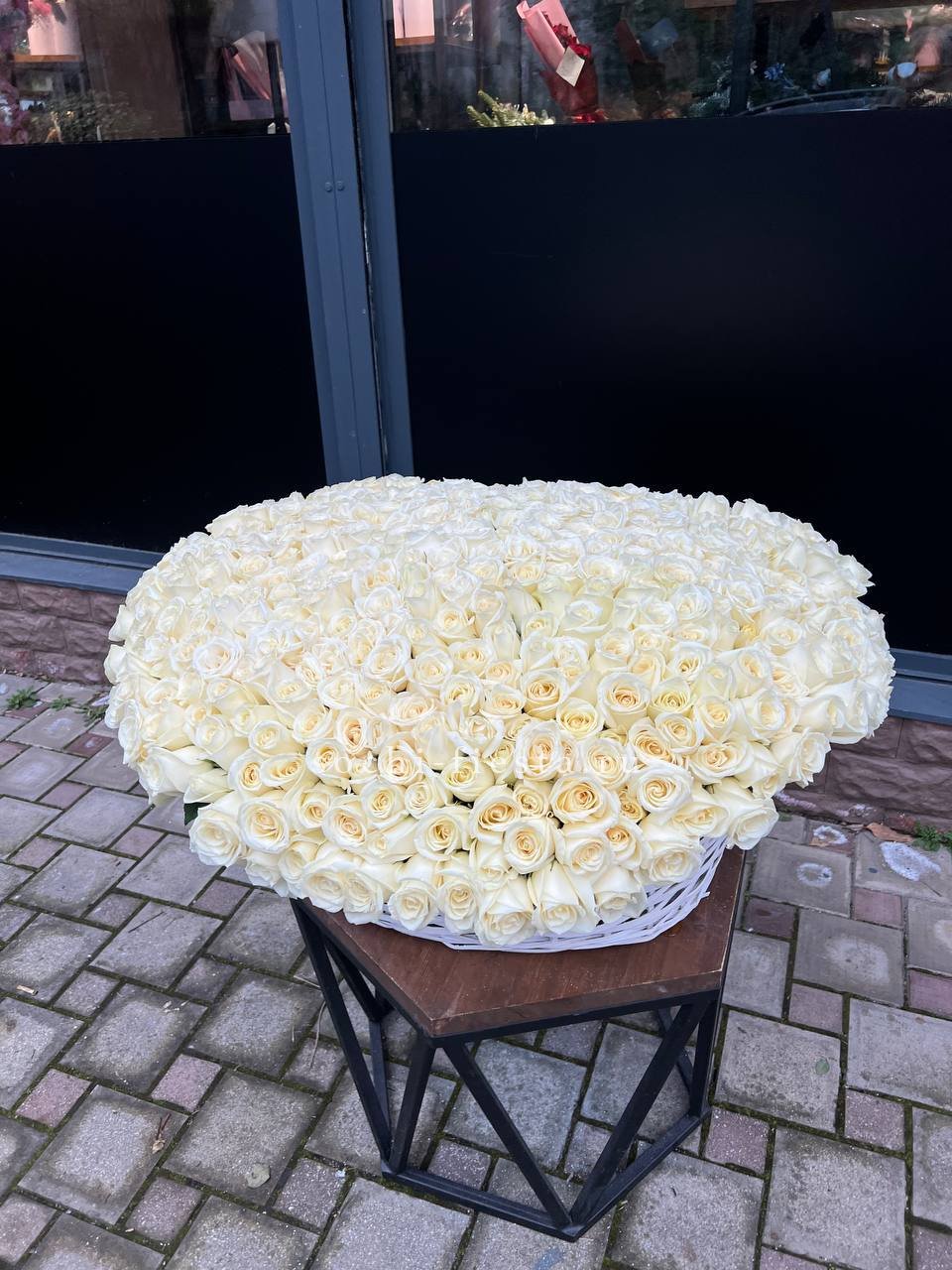 хризантема, кустовая роза, гортензия, белая роза, антиринум, статица, корзина средняя.