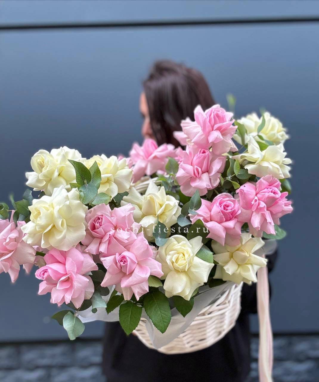 Воздушные соцветия эустомы собраны в округлую композицию с мягким переходом пастельных тонов. Светлая корзина создает легкую базу для объемной цветочной шапки.