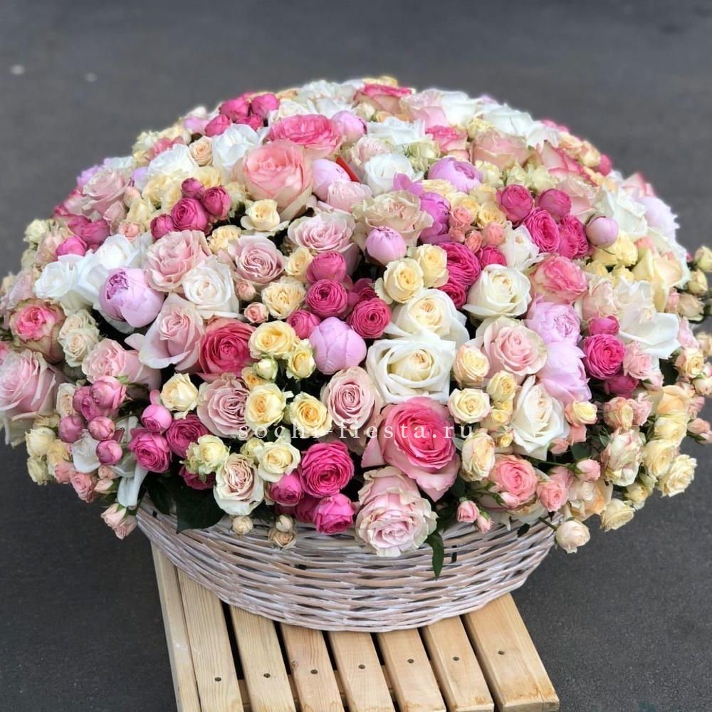 Сорок одна пионовидная роза в светлой корзине выстраивает объёмную композицию с мягкими переливами лилового и розового. Эвкалипт обрамляет густую россыпь бутонов.