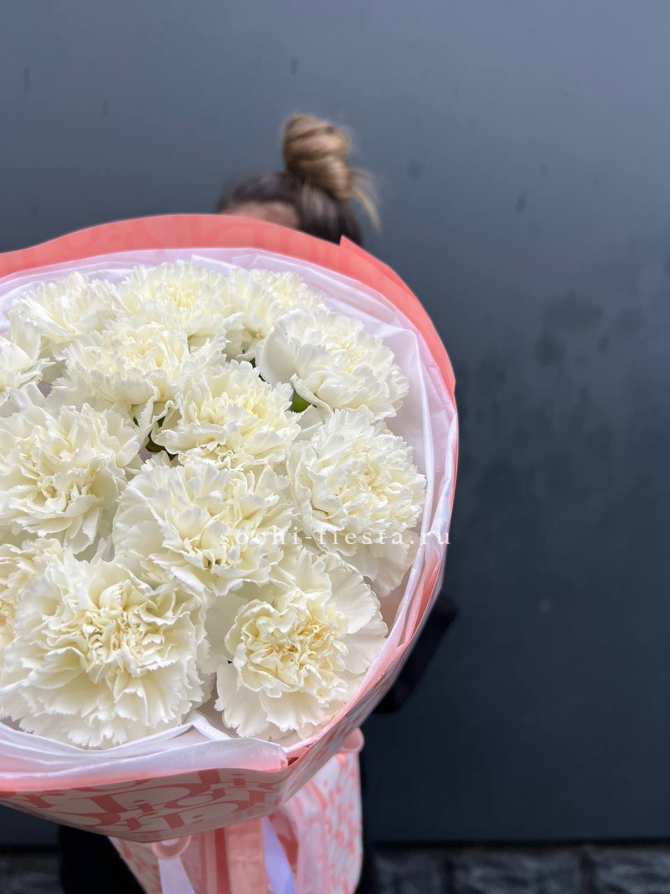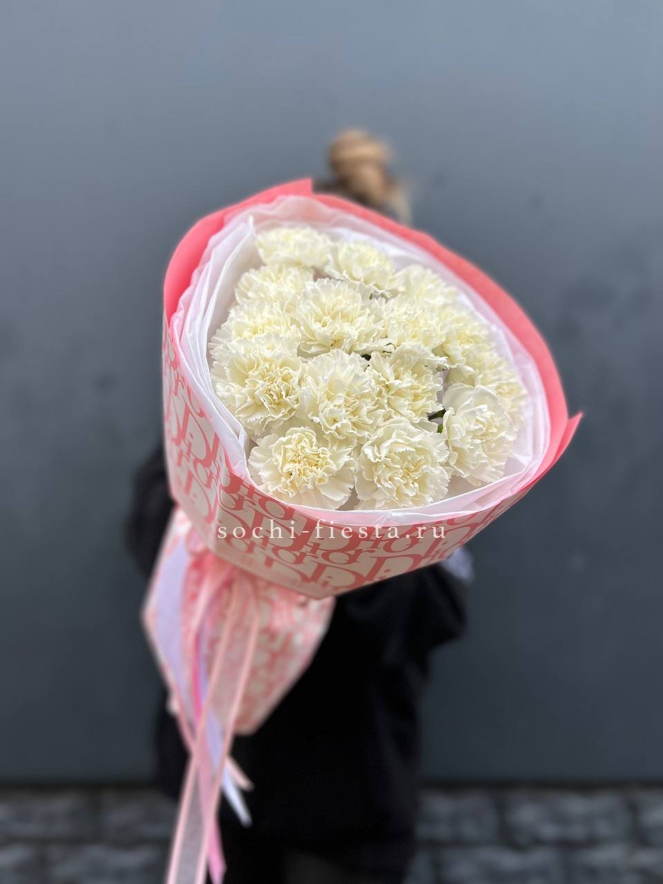 Диантусы с их густыми бутонами и резной формой лепестков выглядят графично и современно. Белый цвет усиливает архитектурность линий и создаёт чёткий визуальный ритм.