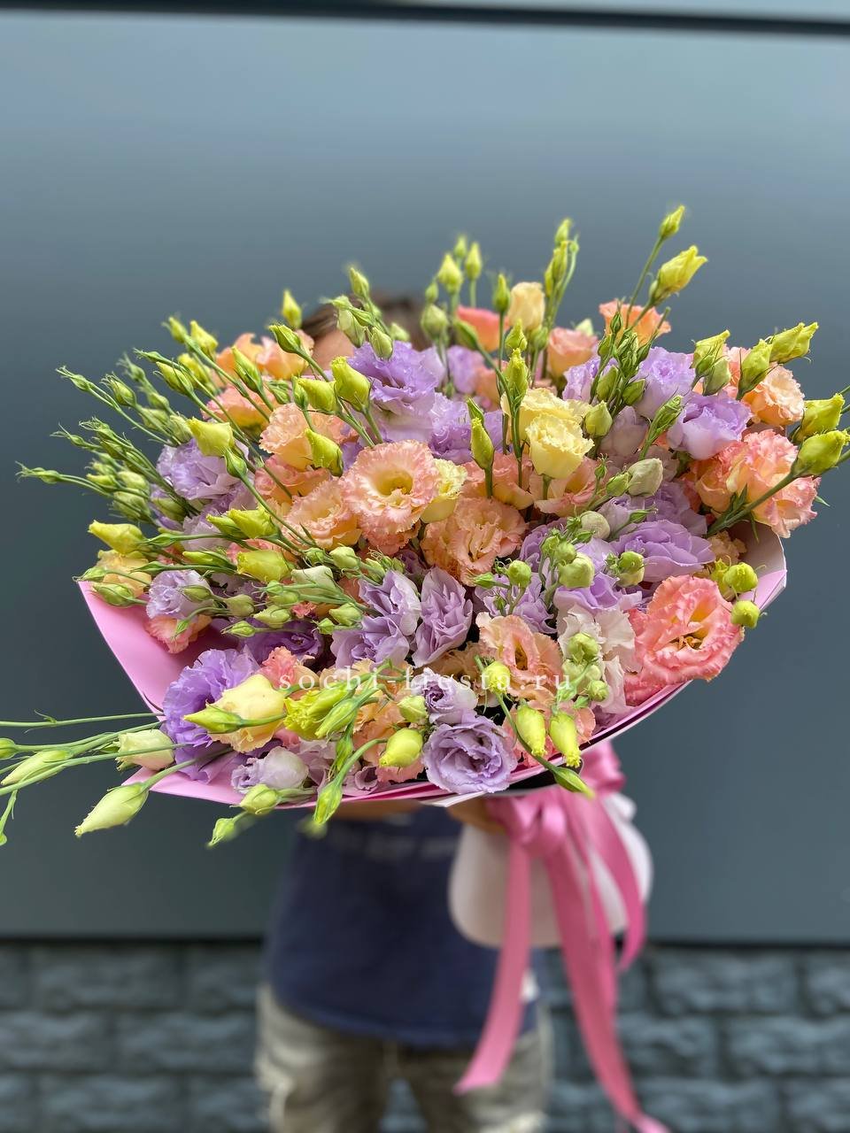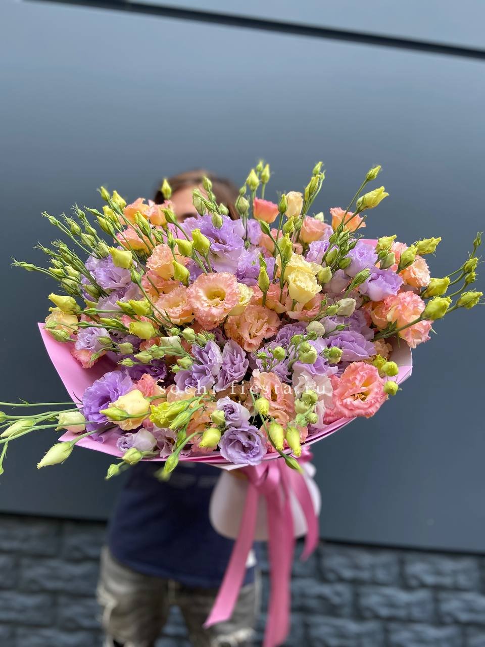 Двадцать пять стеблей эустомы раскрываются пышными соцветиями разной степени роспуска. Плотная сборка формирует выразительный силуэт с живой динамикой линий.