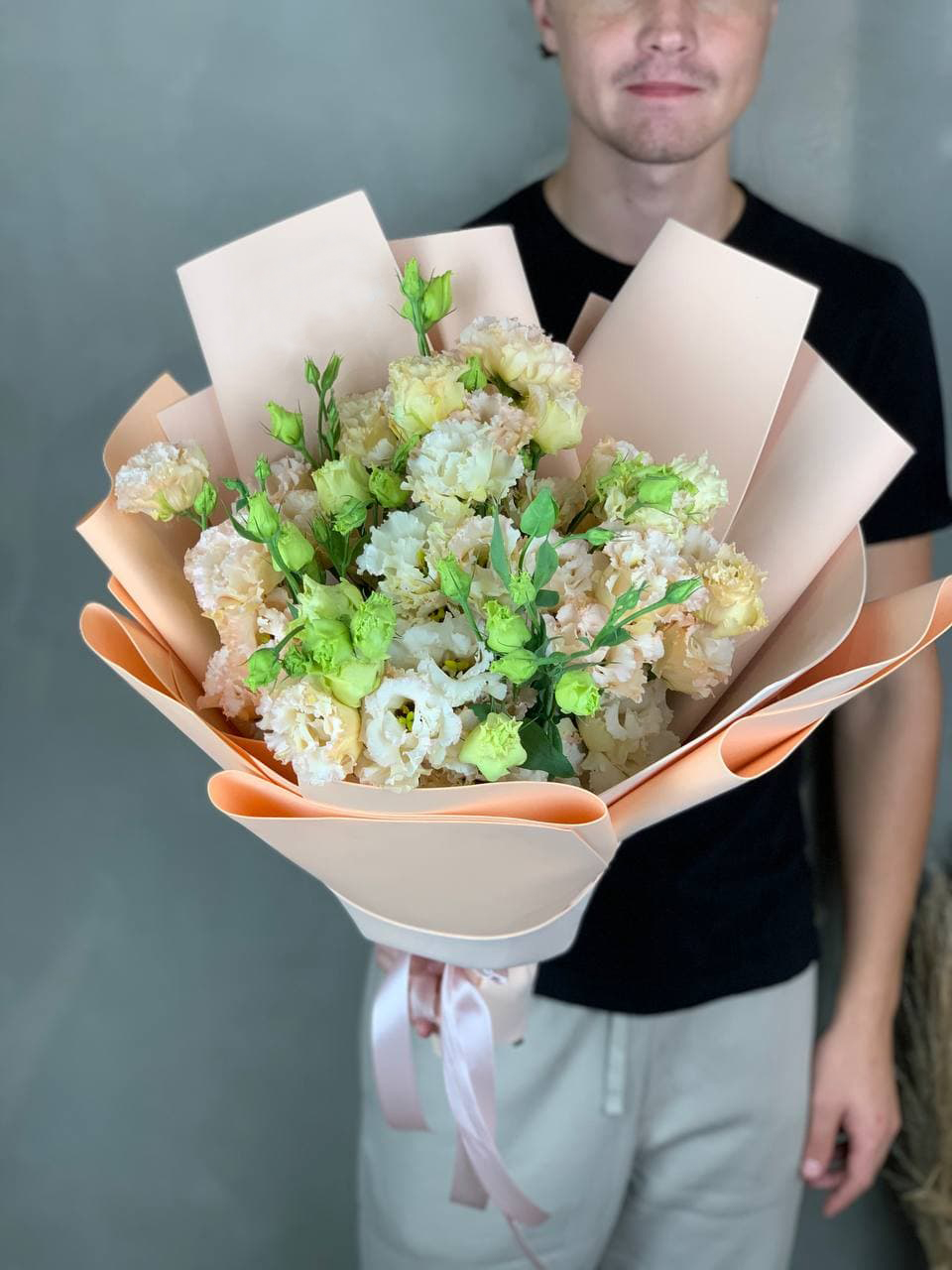 эустома 13-15 веток, лента, дизайнерская пленка или фетр в нежно-розовых тонах.