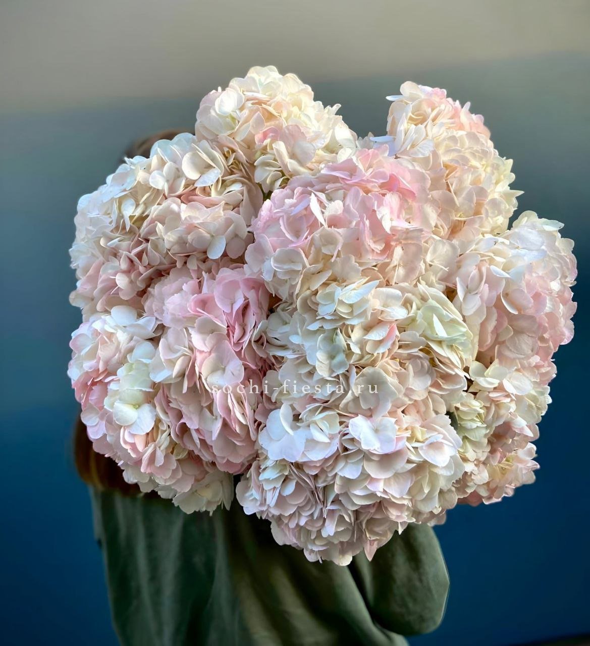 Пять соцветий гортензии в оригинальной упаковке-пиджачке. Необычная форма подачи превращает классический монобукет в яркий акцент для торжественного момента.