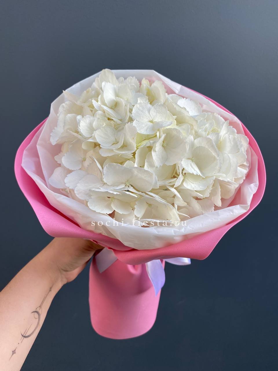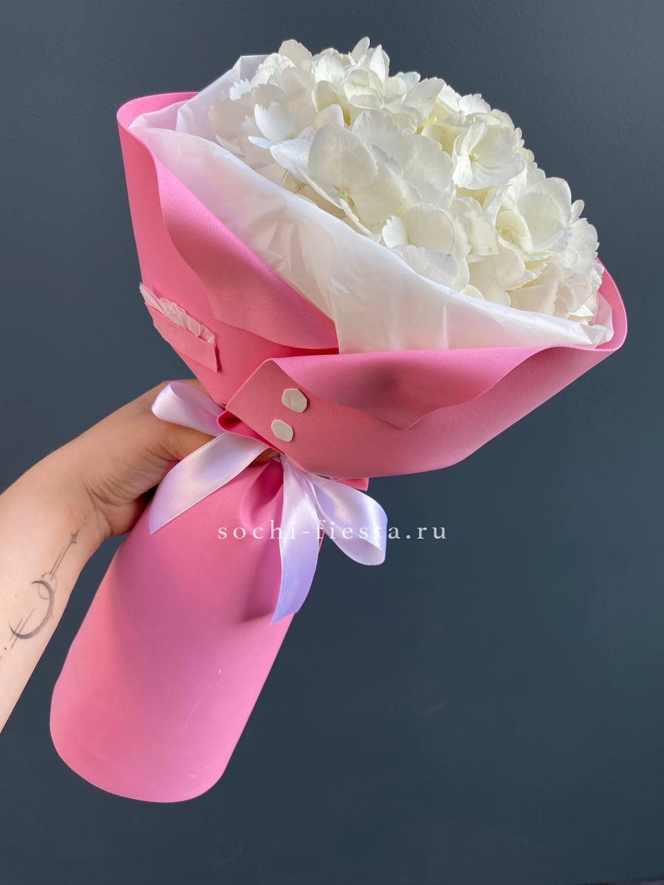 гортензия, лента, зелень по наличию, дизайнерская упаковка.