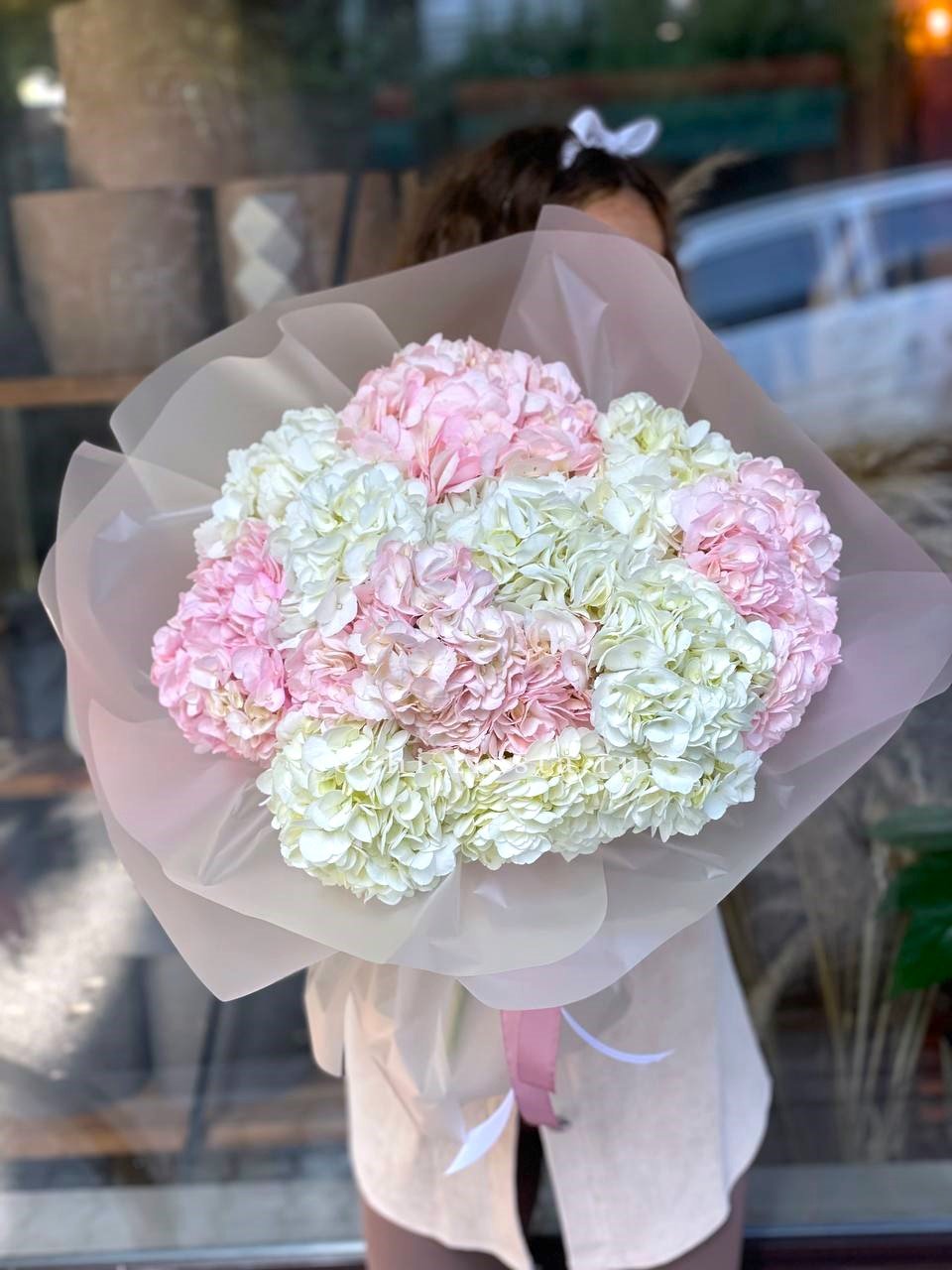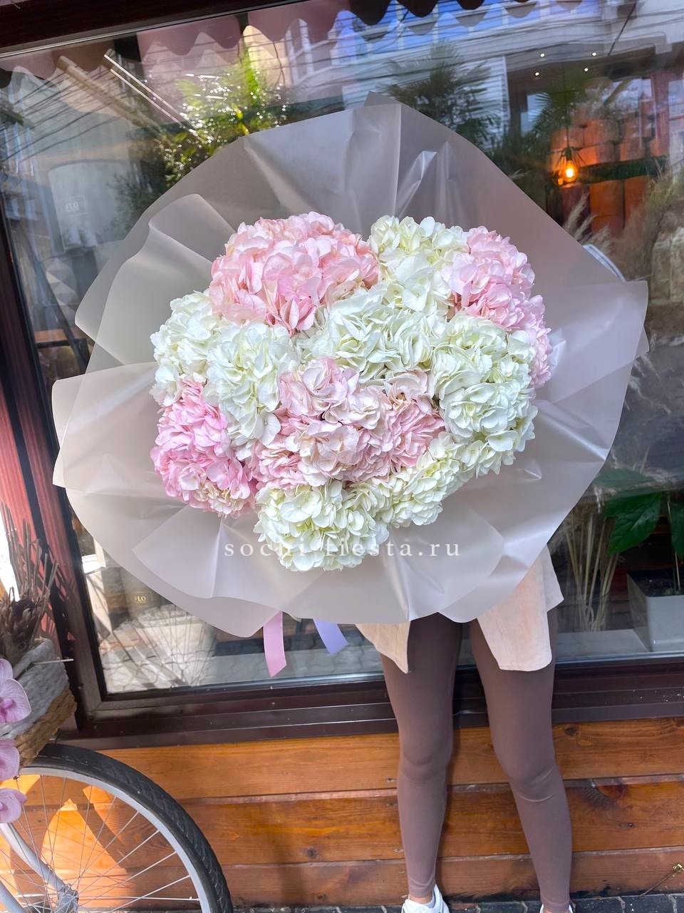 гортензия розовая 9шт., лента, дизайнерская упаковка. Цвет гортензий может незначительно отличаться.