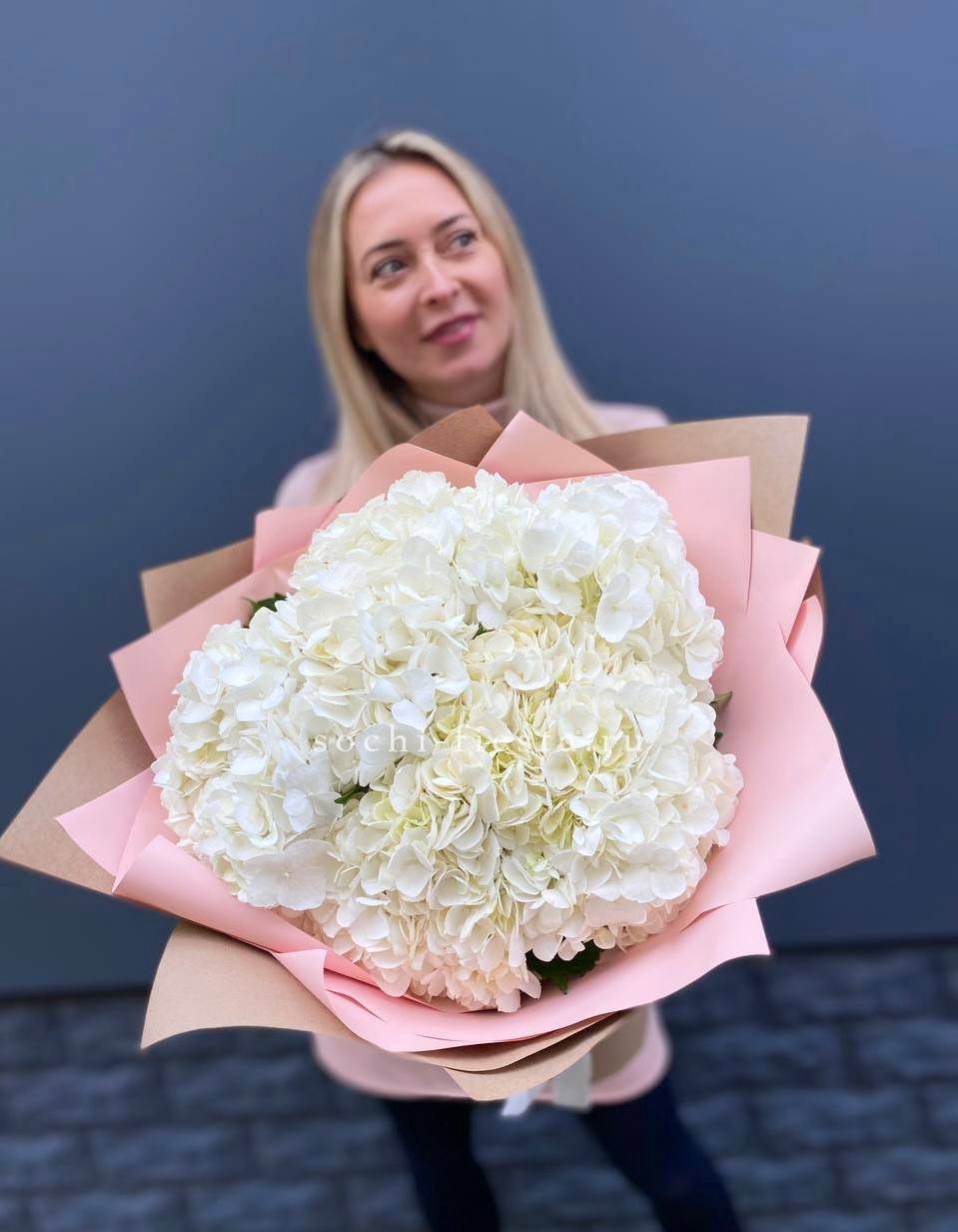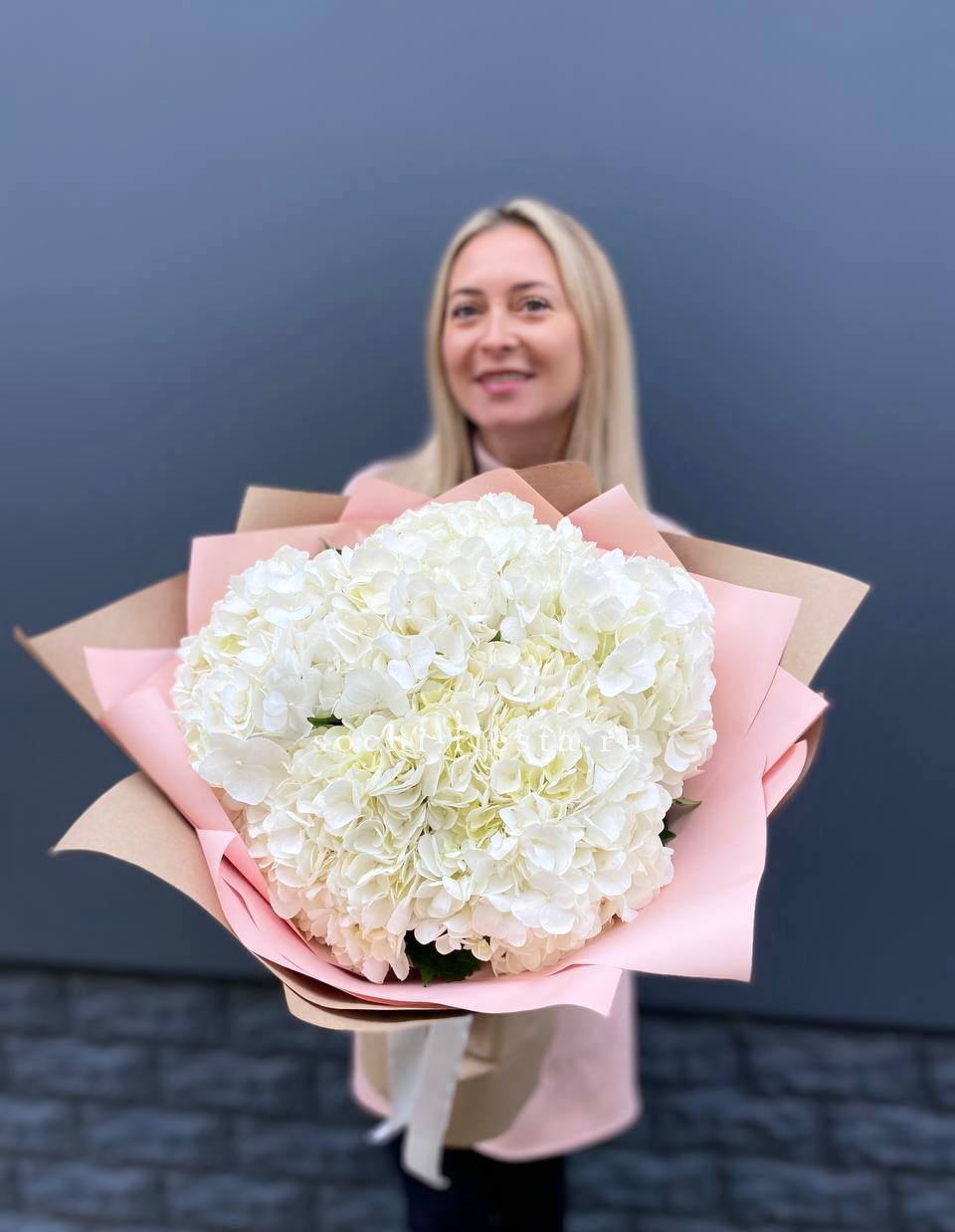 Белоснежное соцветие гортензии с плотной структурой и чистым тоном. Универсальный вариант для минималистичных интерьеров и спокойных решений.