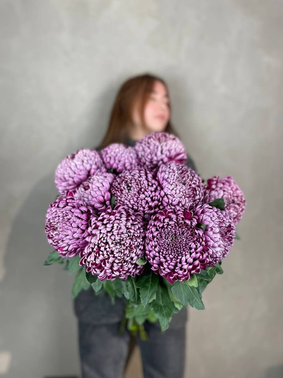 Семь хризантем Palermo образуют лаконичную композицию с чёткими линиями. Крупные соцветия раскрываются широко, заполняя пространство мягкими округлыми формами и создавая ощущение воздушной полноты.