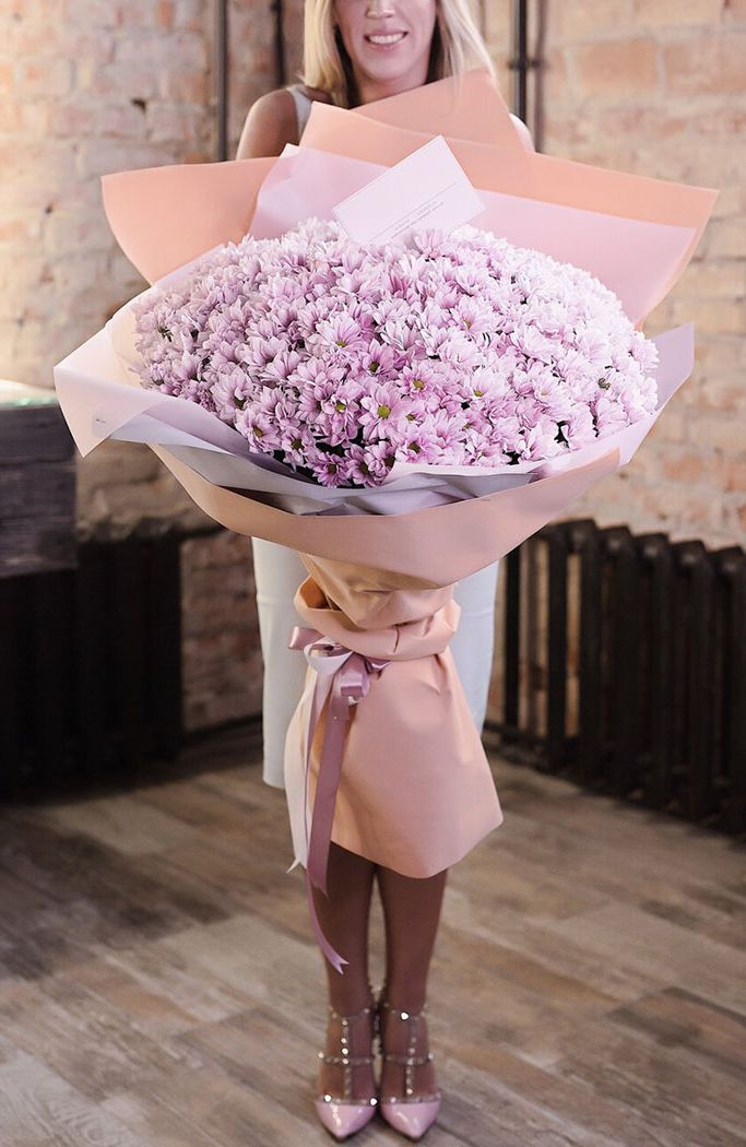 минимальный состав: 7 одноголовых хризантем, лента, упаковка на выбор.