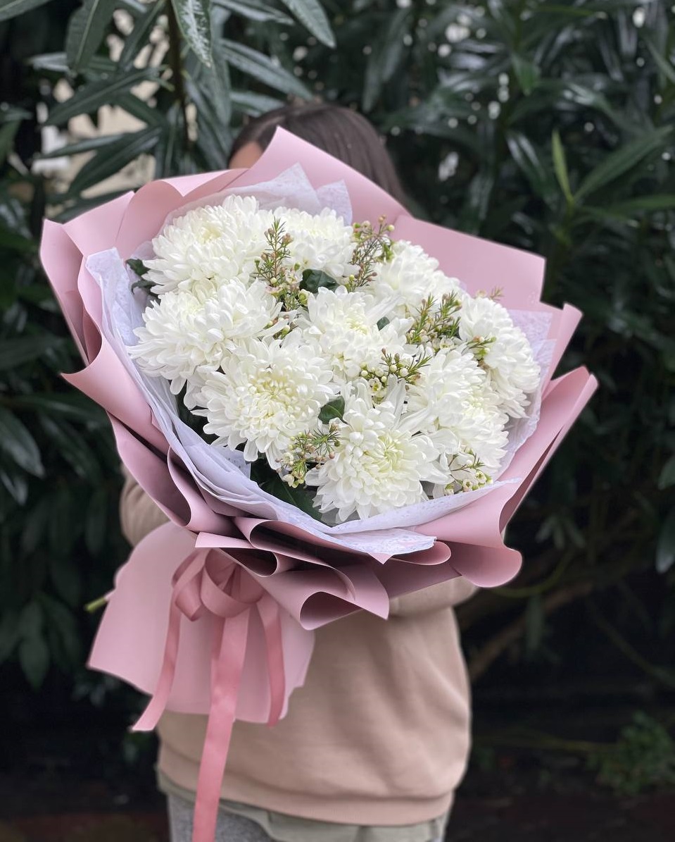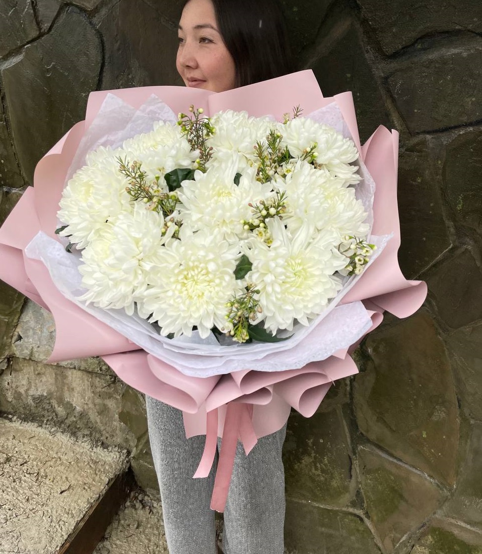 Девять веток кустовой хризантемы образуют пышную шапку соцветий в розовой гамме. Каждая ветка раскрывается множеством бутонов, создавая объёмную текстуру и живую игру оттенков. Упаковка завершает композицию, сохраняя её естественную воздушность.