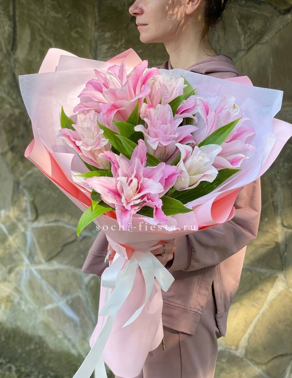 Пионовидные лилии раскрываются многослойными бутонами с густыми лепестками. Семь соцветий образуют пышную форму с выраженной фактурой и глубиной. Композиция впечатляет визуальной насыщенностью и природной красотой.