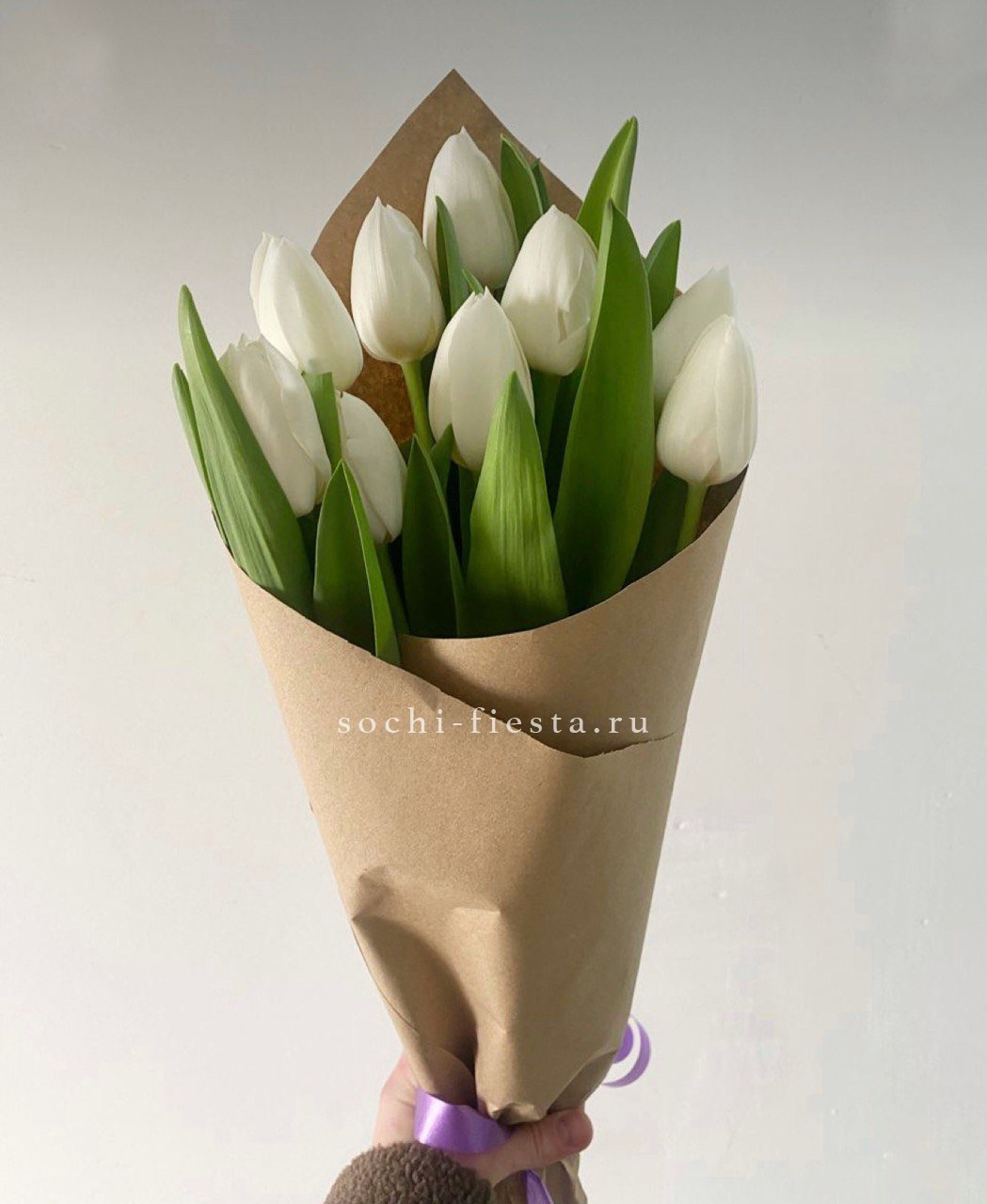 Девять белых тюльпанов в натуральной крафтовой обёртке. Лаконичная форма букета сохраняет естественную красоту каждого бутона. Минималистичное решение для современного интерьера.