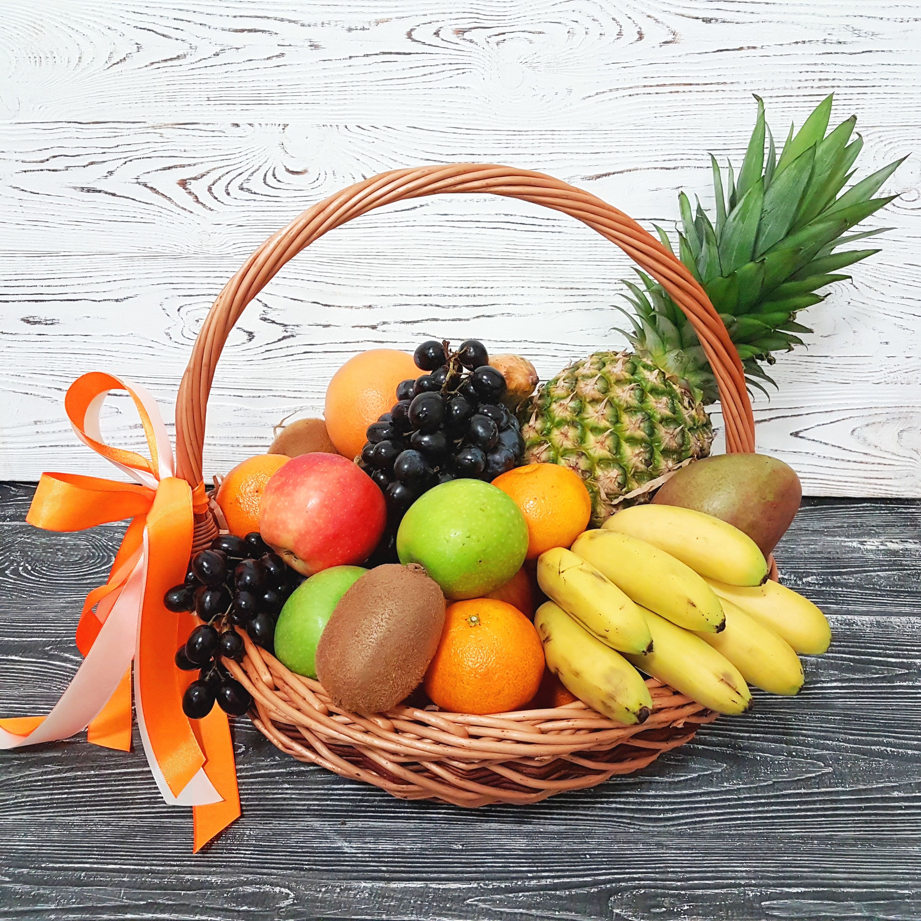 фруктовая композиция в темной корзине из винограда, бананов, груш, яблок, апельсинов, киви и ананасаГотовая композиция может иметь незначительные внешние отличия от примера на фотографии.