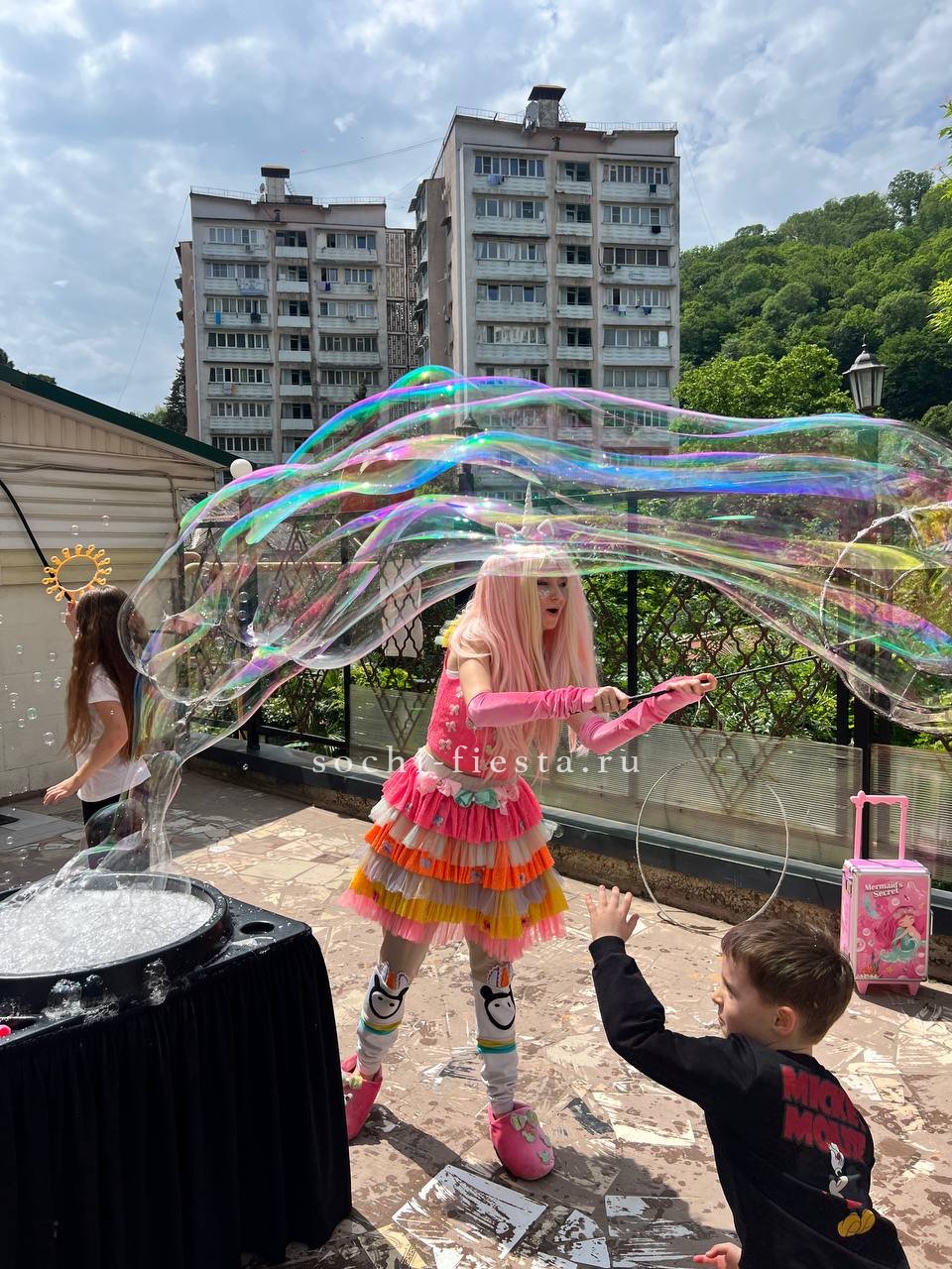 Шоу мыльных пузырей — яркое и захватывающее представление, в котором мастер создает огромные, разноцветные и необычные мыльные пузыри разного размера. В программе используются специальные техники и инструменты для формирования фантастических фигур, пузырей-гигантов и эффектных трюков. Это зрелищное шоу радует зрителей своей красотой, магией и атмосферой веселья, особенно популярное среди детей и семей.