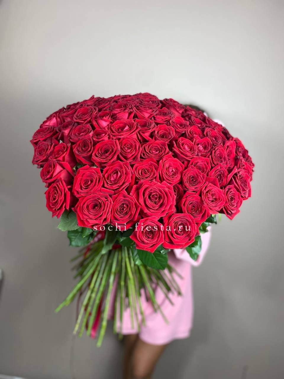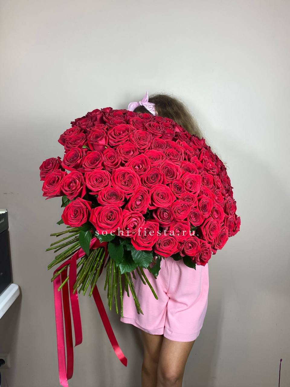 Сто один бутон в бело-розовой палитре создают объёмное облако цвета. Композиция впечатляет масштабом и наполняет пространство мягким сиянием лепестков.