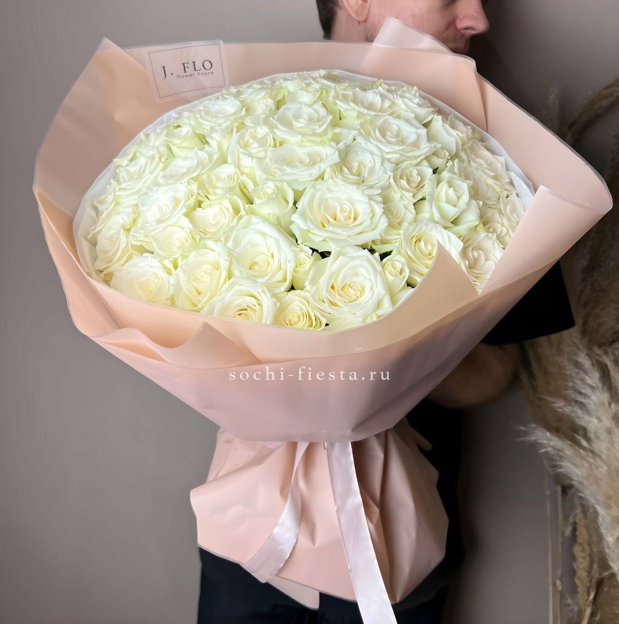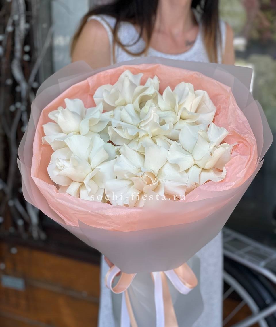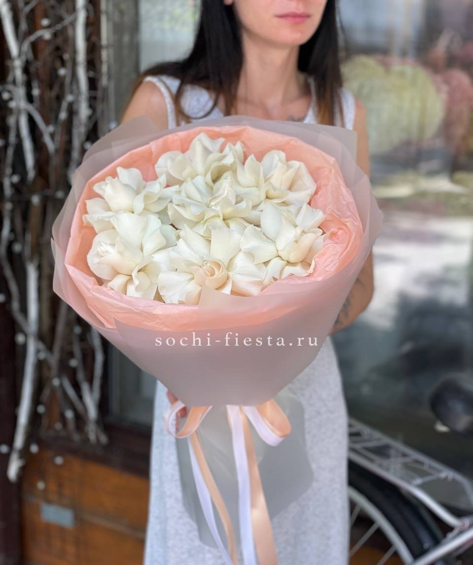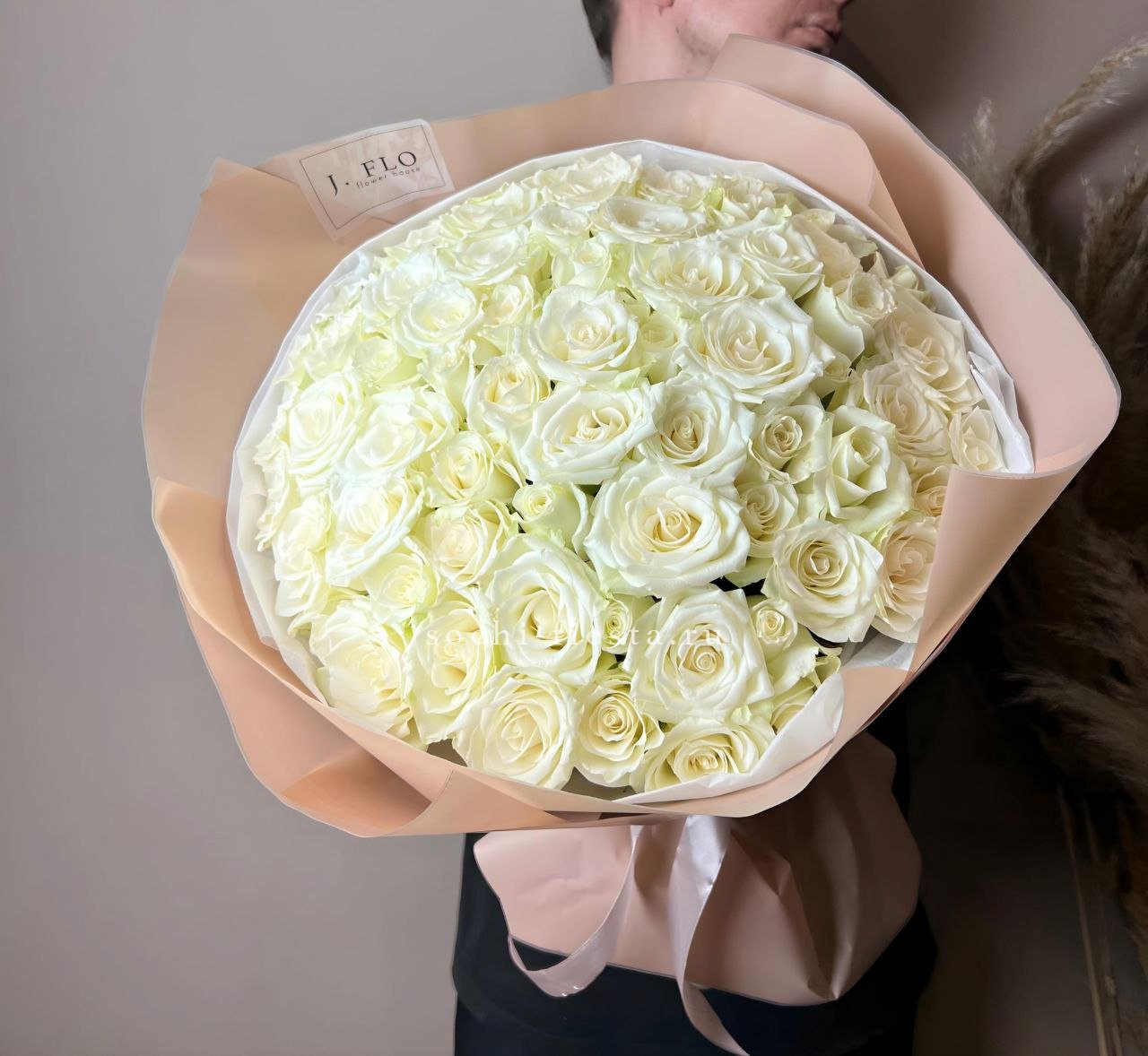 Девятнадцать белых роз в лаконичной крафтовой упаковке держат чёткий силуэт. Прямые стебли и плотные бутоны создают графичную композицию.