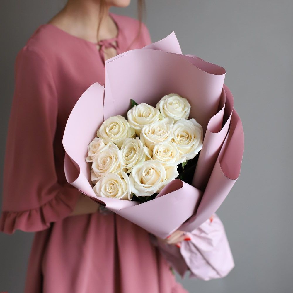 Тридцать пять белых бутонов образуют плотный монохромный ансамбль. Классическая форма и чистота оттенка позволяют букету звучать самодостаточно в любом интерьере.