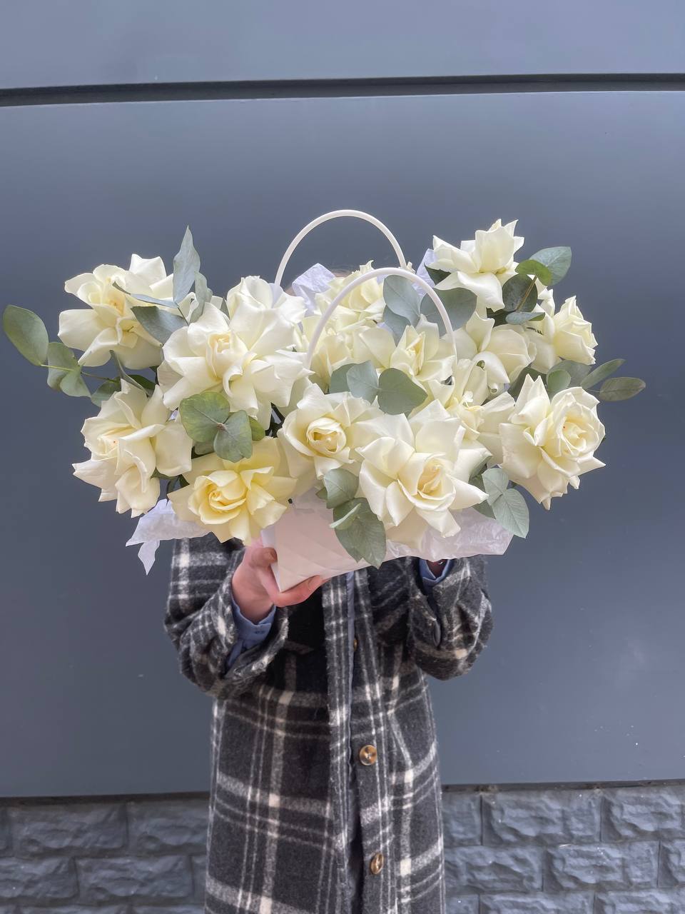 Белые розы собраны в плотную округлую форму с ровным силуэтом. Дизайнерская упаковка подчёркивает графичность линий и создаёт завершённую композицию. Букет с выразительным присутствием.