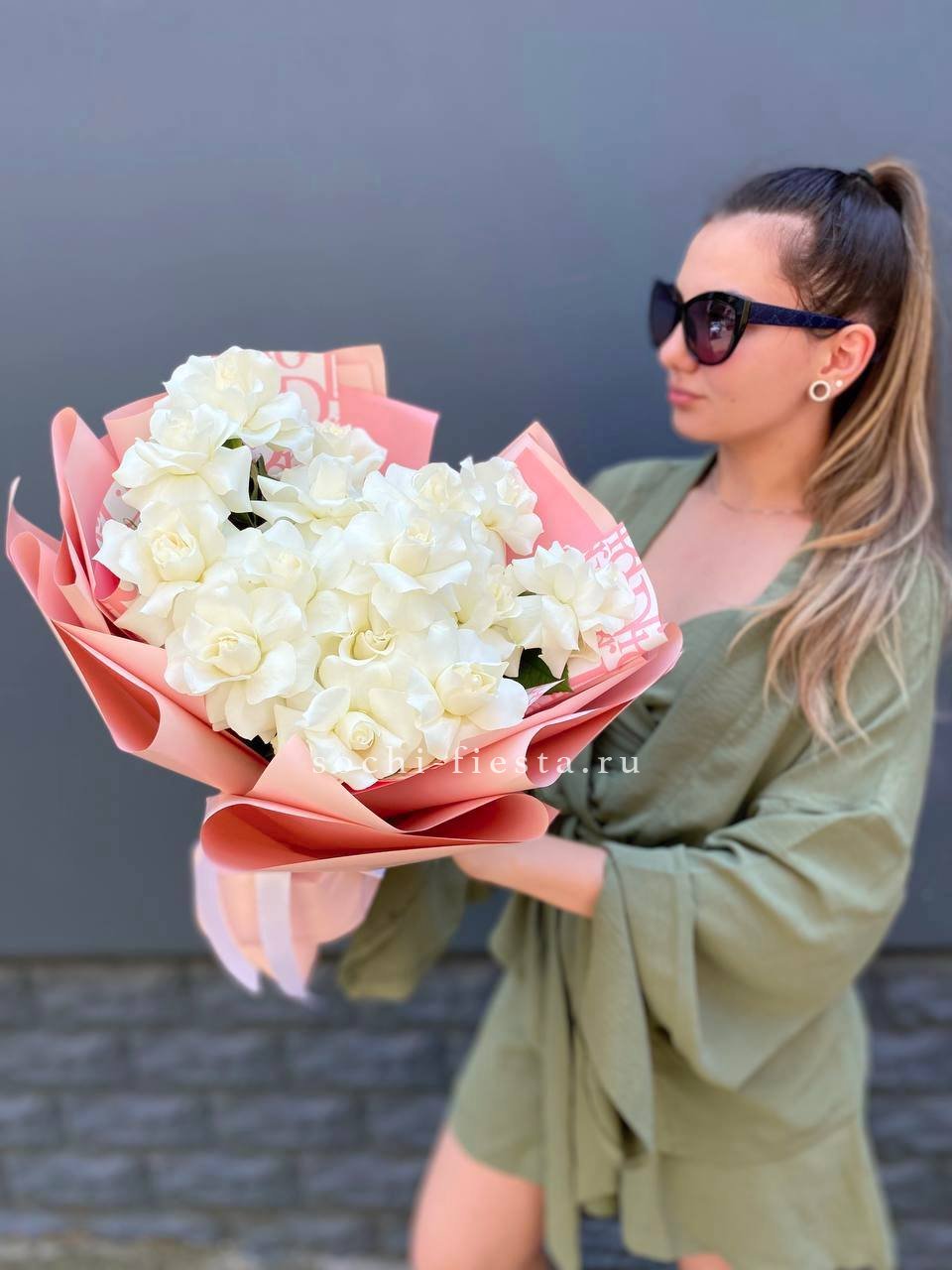 Пятнадцать белых роз собраны в плотный букет с чистыми линиями. Прозрачная упаковка сохраняет свежесть и открывает естественную красоту бутонов.