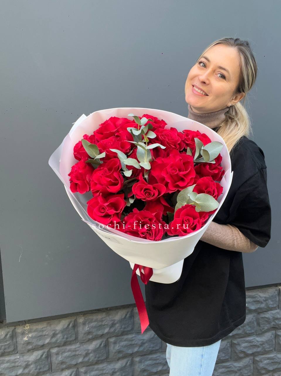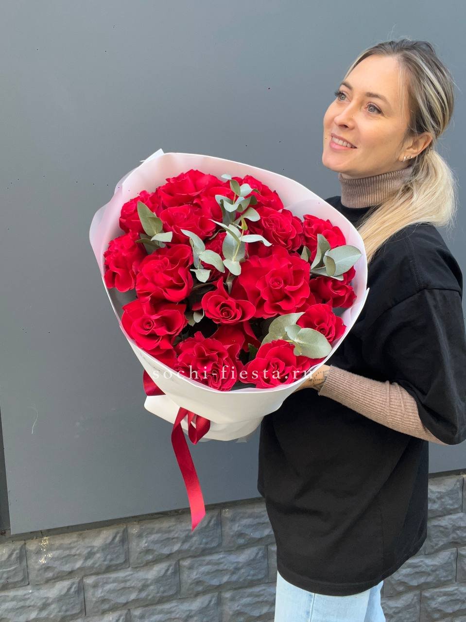 Сто один бутон сорта Лолита раскрывается бархатными лепестками глубокого красного цвета. Высокие стебли формируют объемную композицию с выразительным силуэтом. Классика в современной подаче.