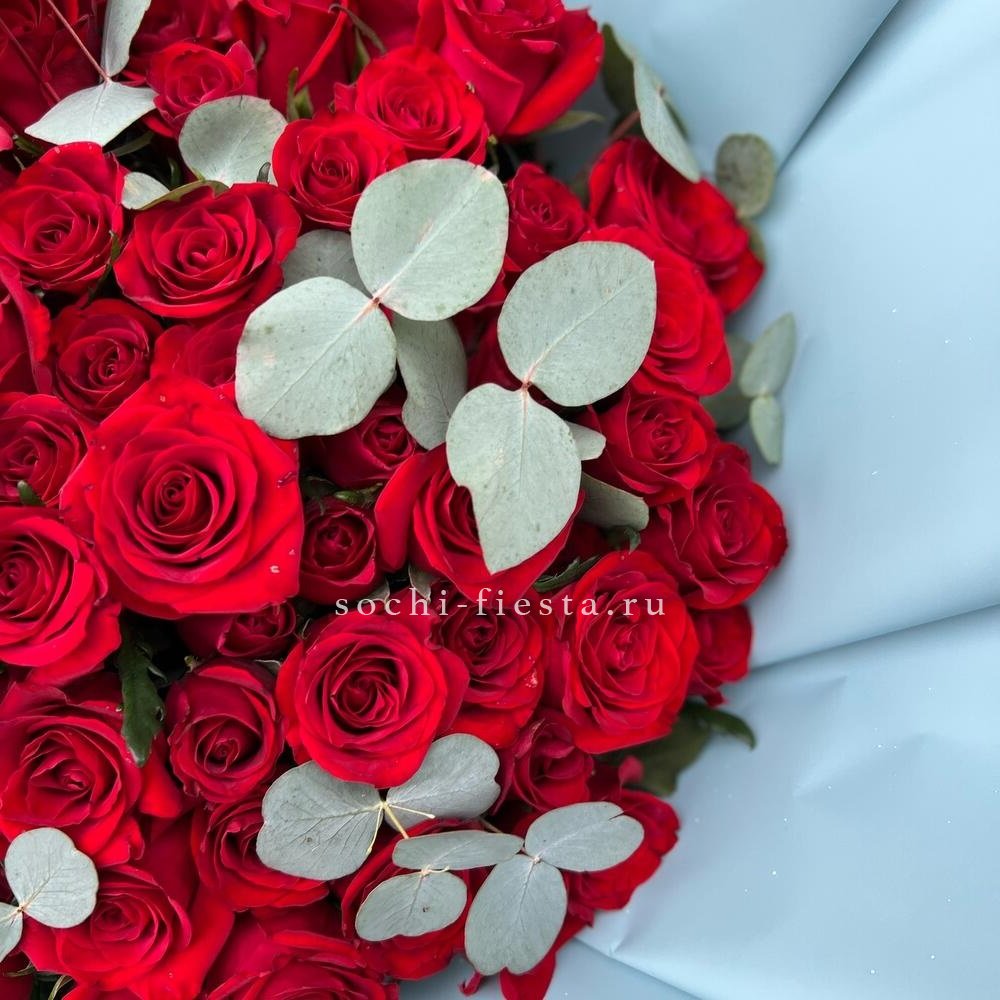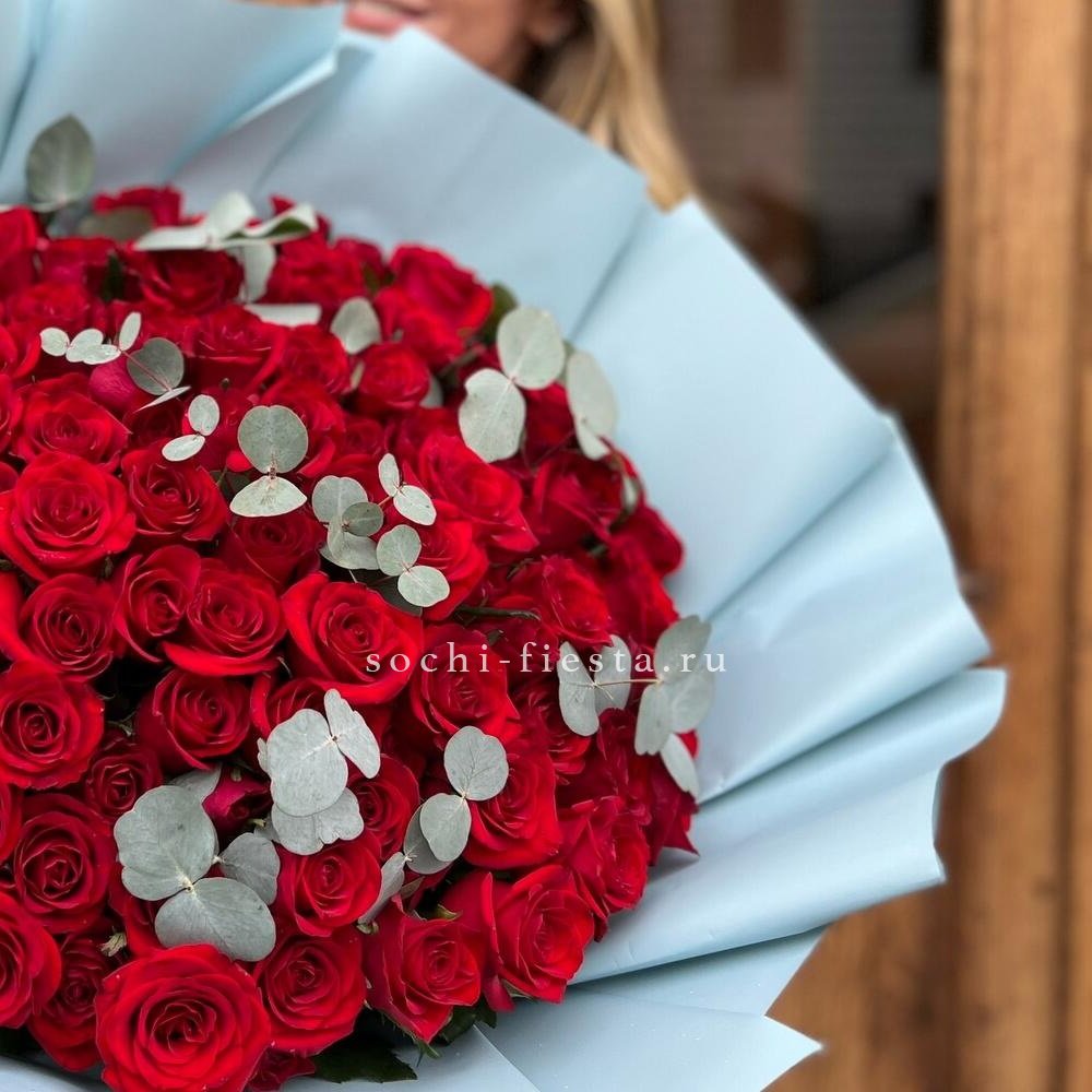 101 красная роза с эвкалиптом