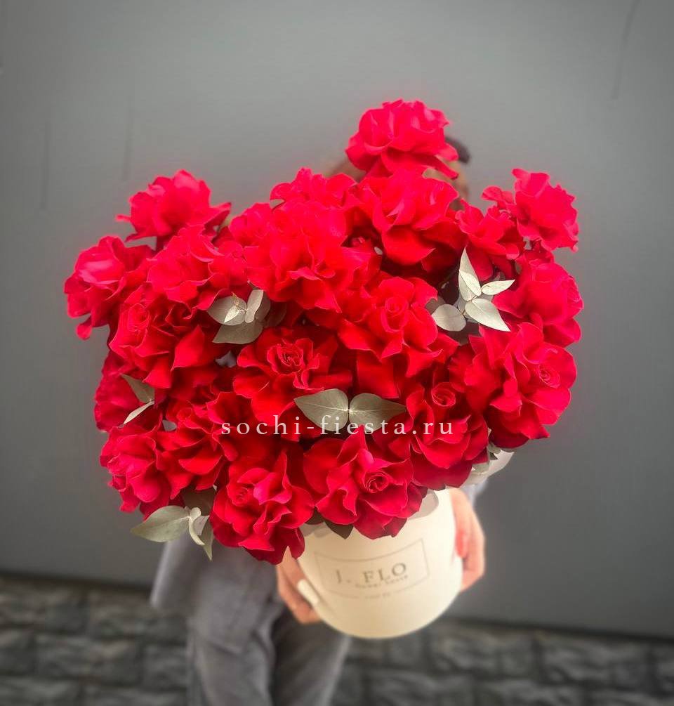 вывернутые красные розы, цилиндр D20, эвкалипт, лента, упаковка.