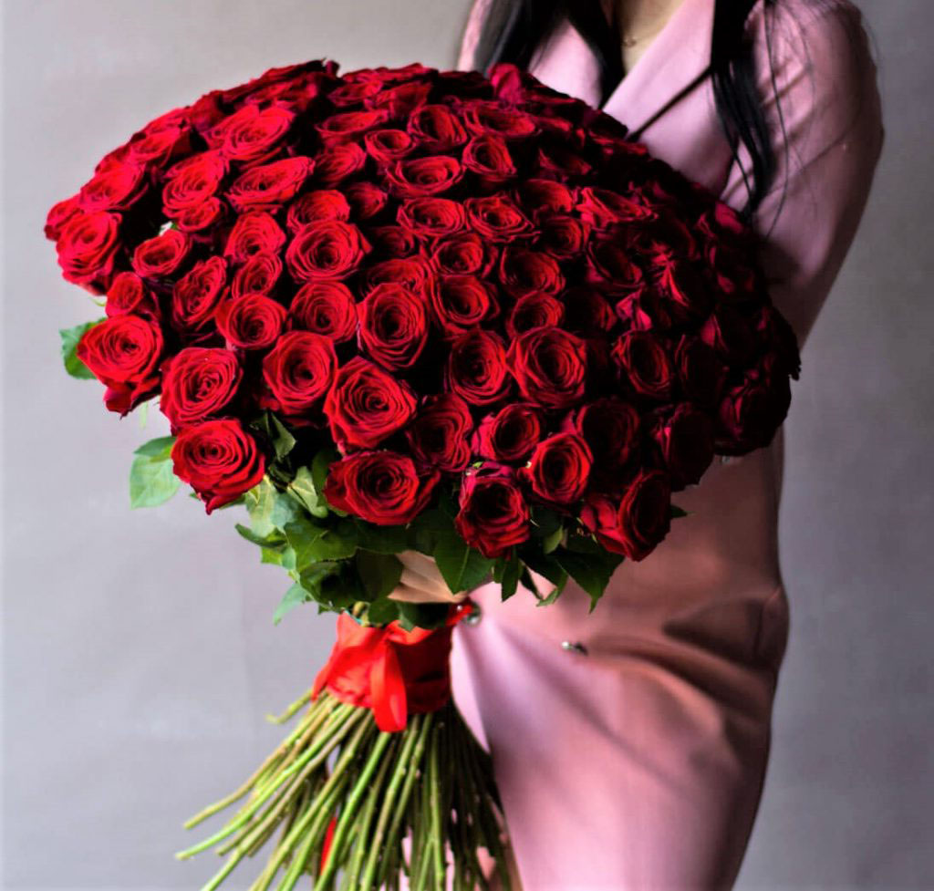 Классическая красная гамма в масштабной подаче. Тридцать семь стеблей формируют округлую композицию с четким силуэтом. Букет занимает пространство и сразу привлекает внимание.