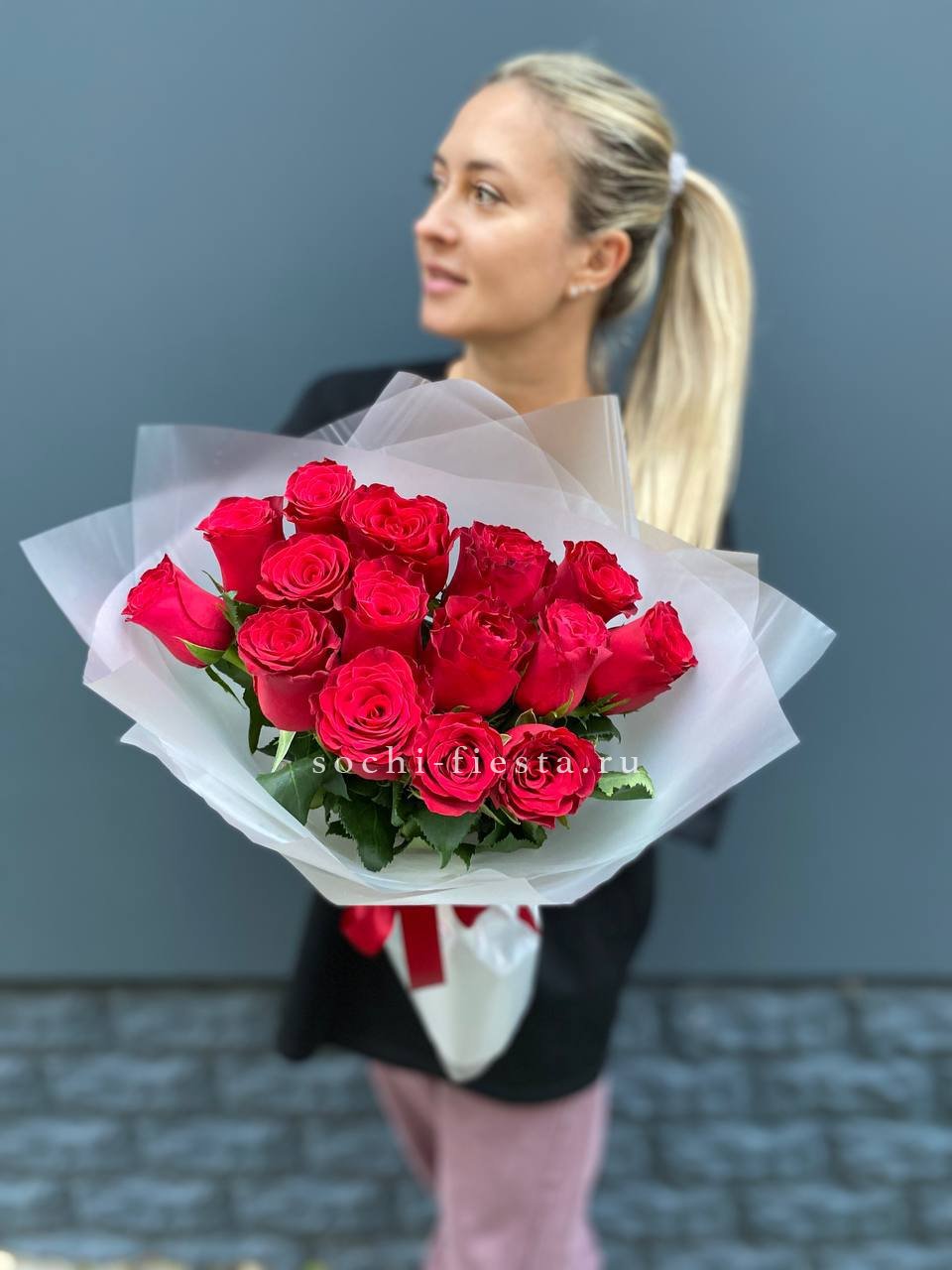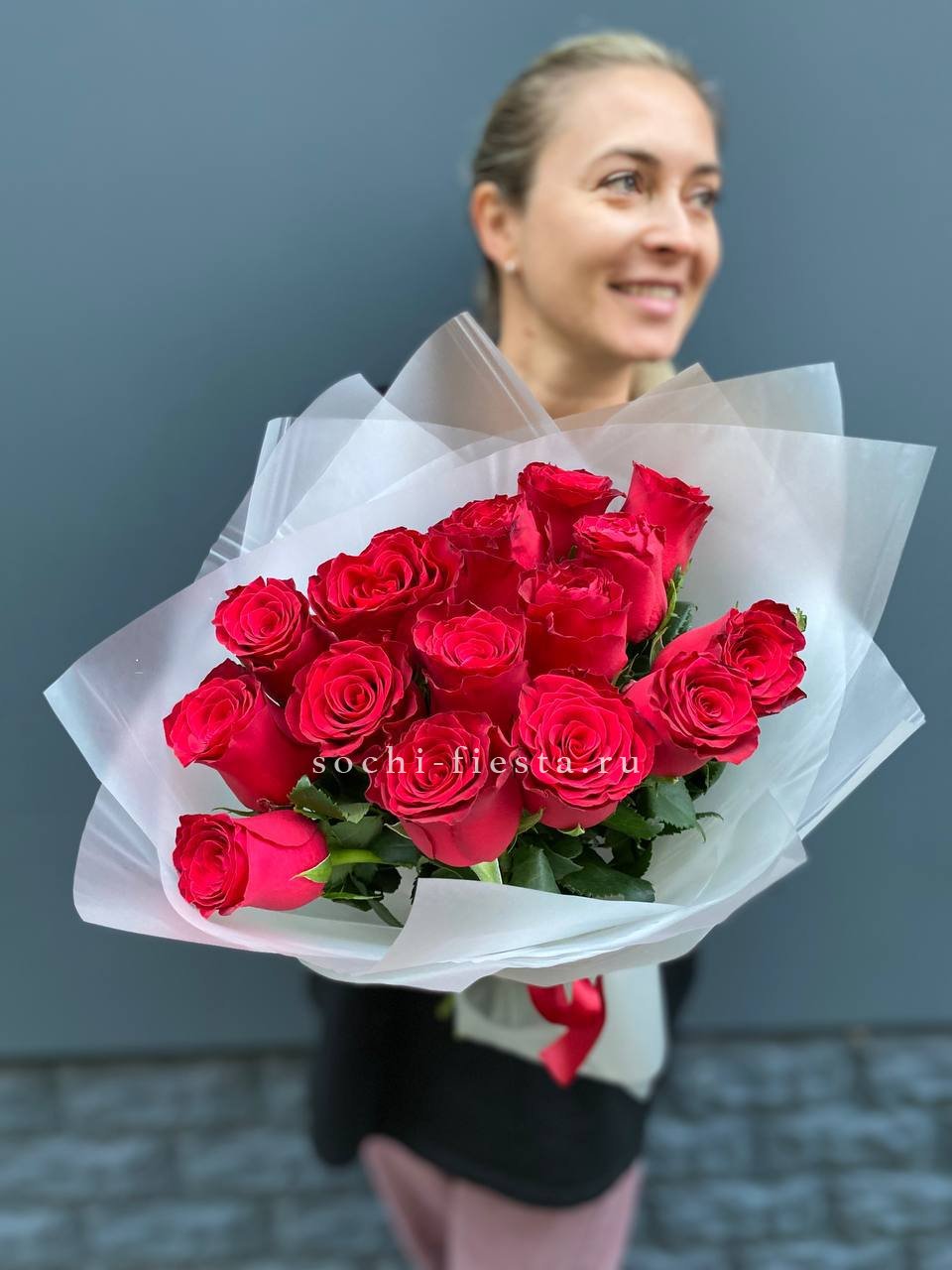 Пятнадцать бутонов насыщенного красного оттенка собраны в плотную композицию. Классическая форма с авторским оформлением подходит для романтичных жестов и ярких моментов.
