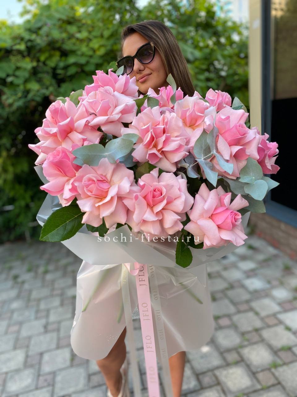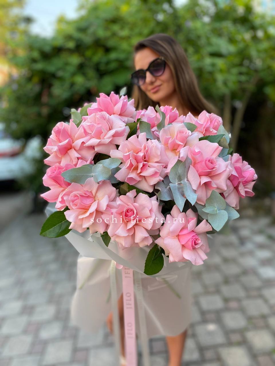 Семнадцать вывернутых роз открывают фактурную глубину лепестков и создают объемную композицию. Каждый бутон раскрывается по-своему, а эвкалипт добавляет воздушности общей форме.