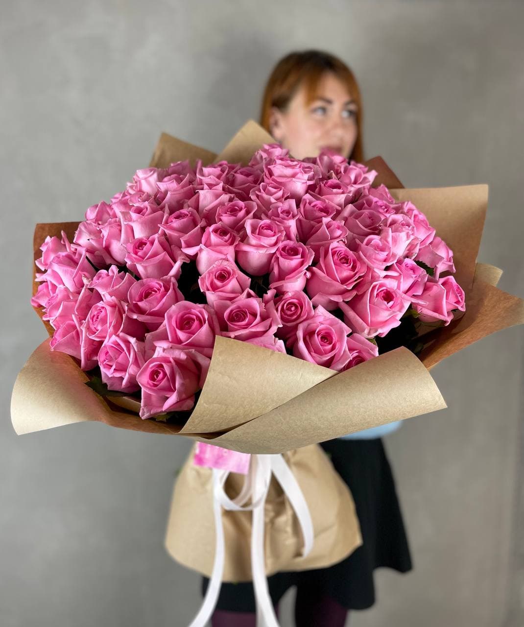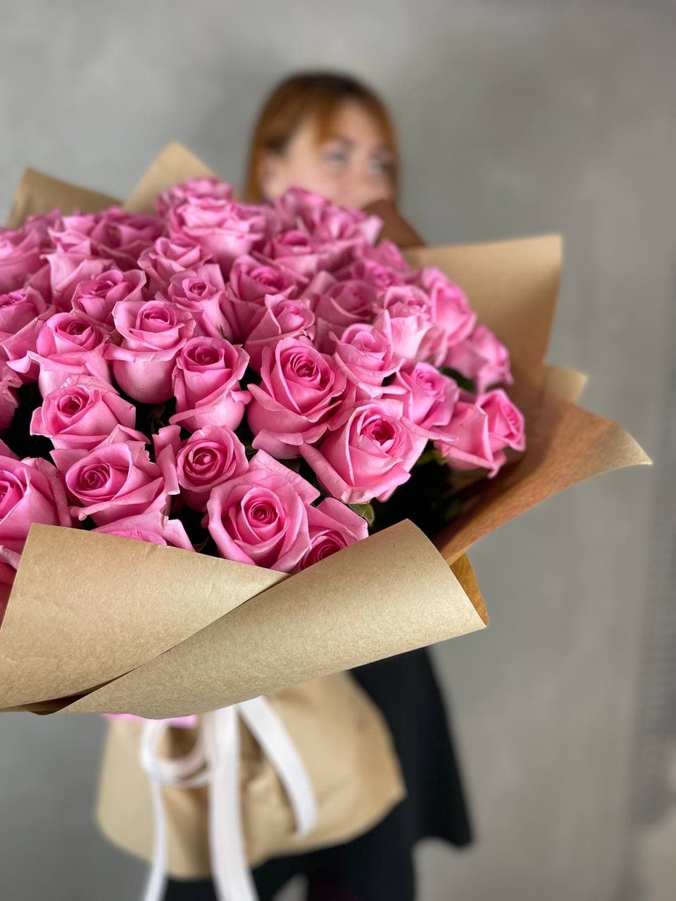 Девять бутонов собраны в компактную форму и обернуты крафтом. Розовый оттенок мягкий и натуральный. Букет занимает мало места и долго сохраняет свежесть.