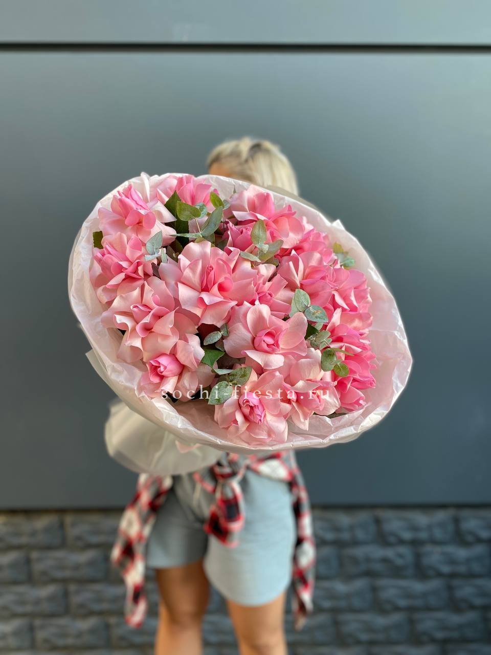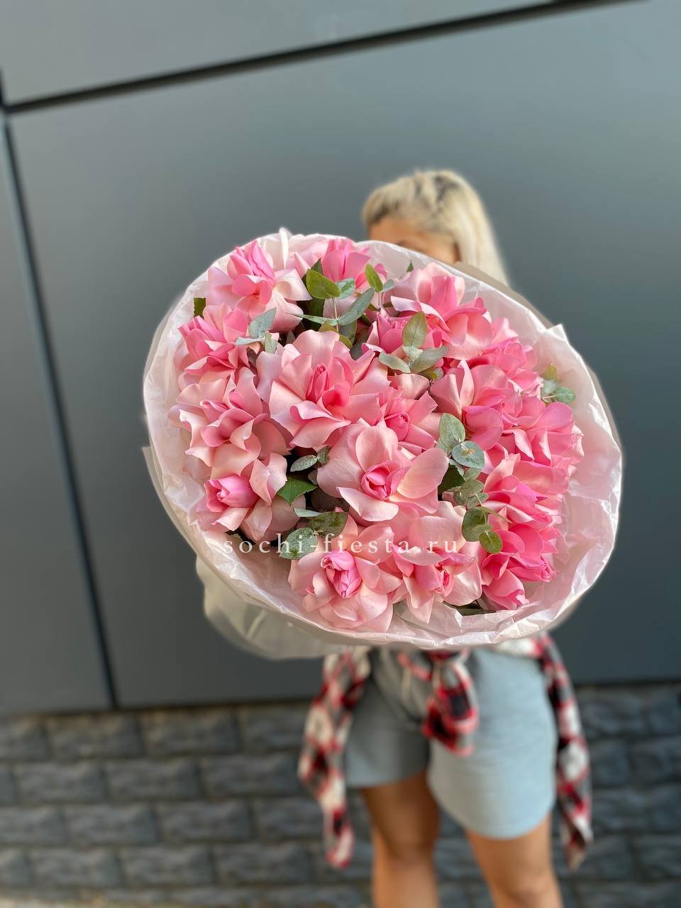 Двадцать одна роза в оригинальной упаковке с игривыми ушками создает настроение легкости и свежести. Розовые бутоны собраны в аккуратную композицию, которая удерживает форму и выглядит выразительно в любом интерьере.