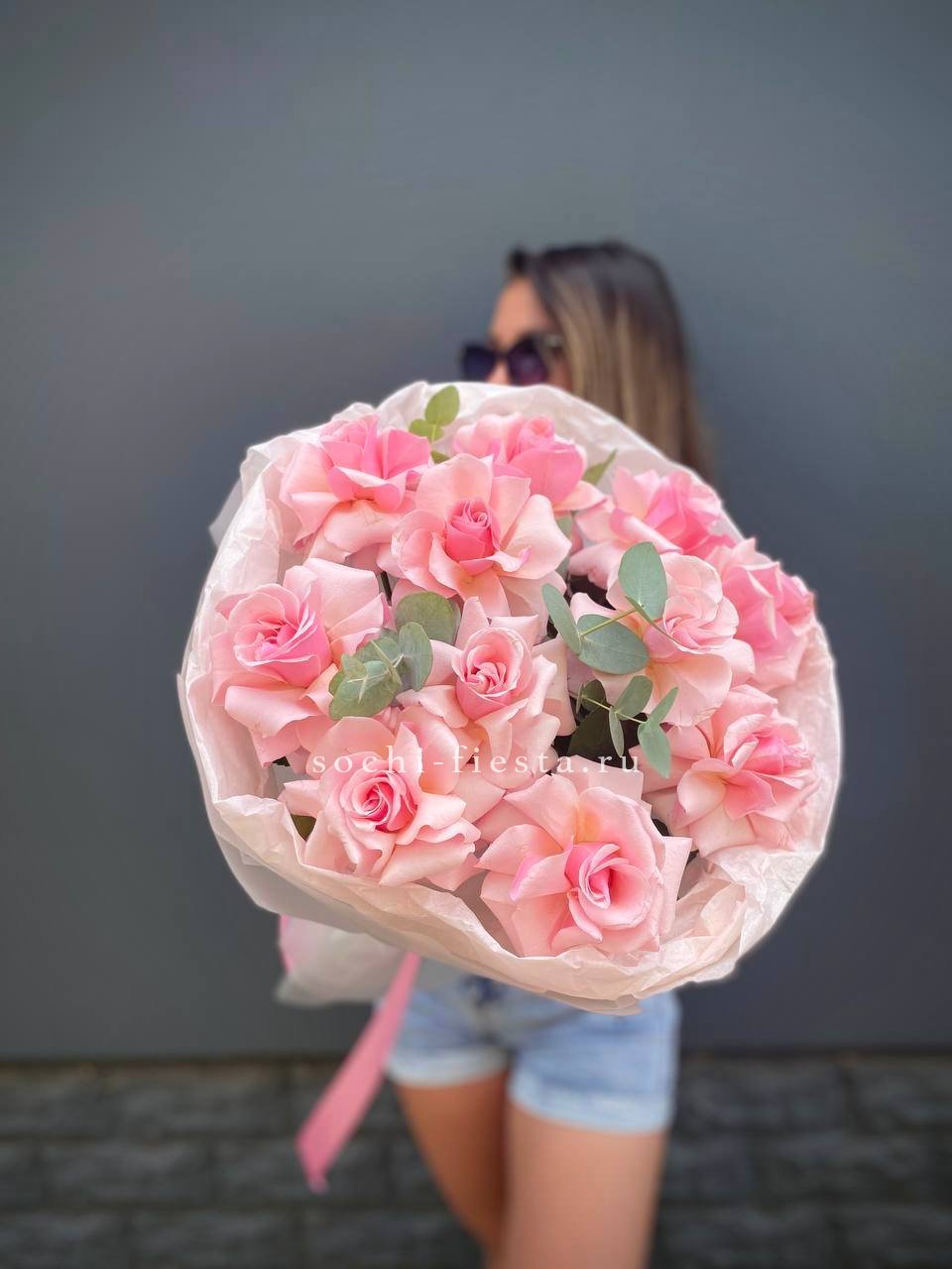 Одиннадцать вывернутых роз с открытой сердцевиной притягивают взгляд игрой света на лепестках. Авторская упаковка и веточка эвкалипта завершают композицию.