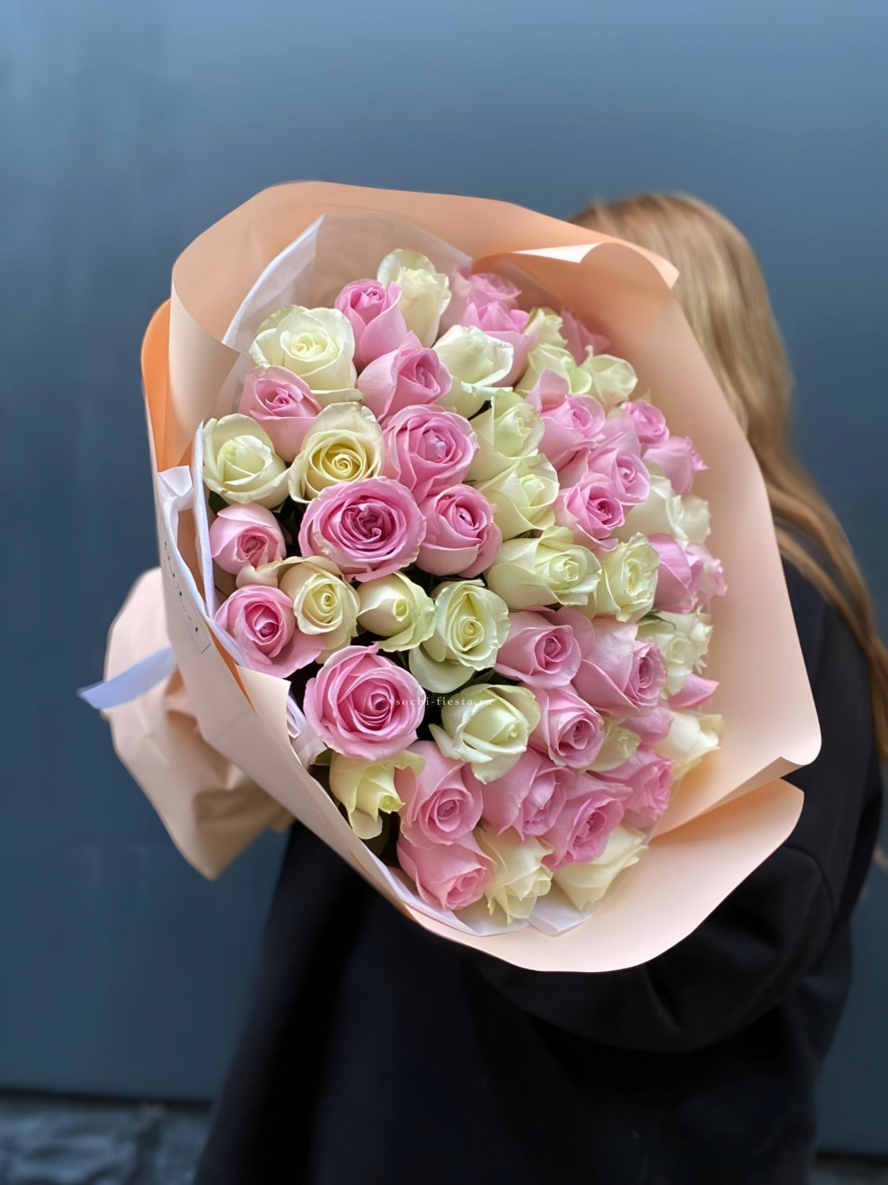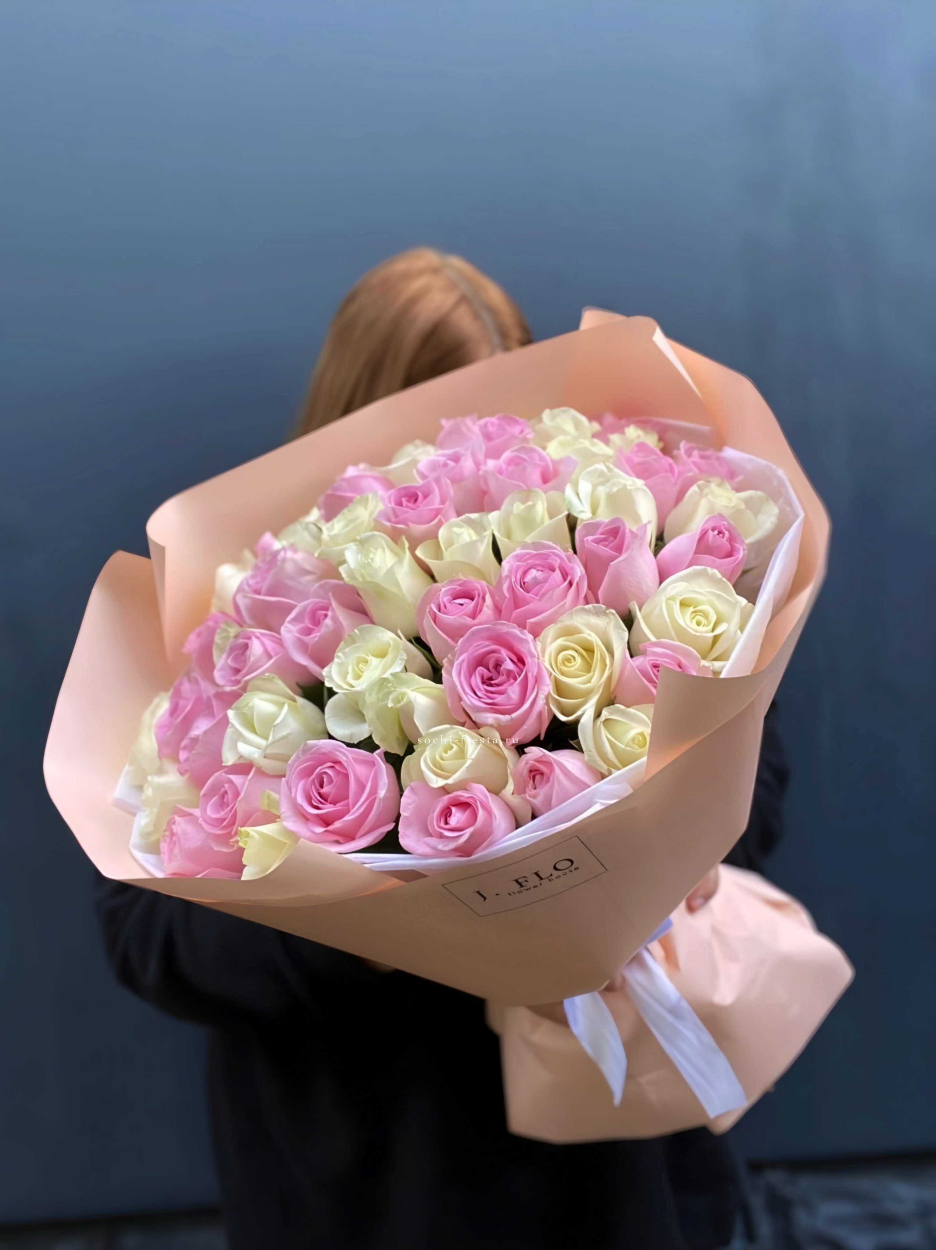 Розовые бутоны собраны в свободную форму с мягкими переходами по высоте. Лепестки играют оттенками от пудры до персика и создают живую подвижную текстуру.