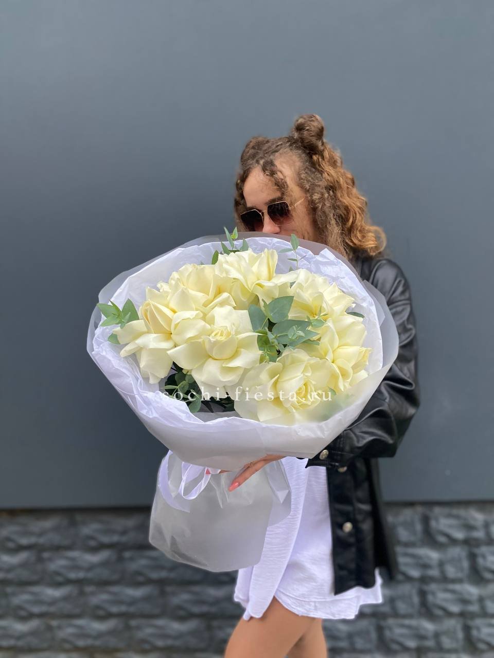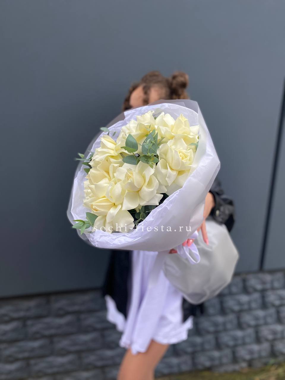 Пять французских роз с вывернутыми лепестками раскрываются широко и создают эффект лёгкой небрежности. Эвкалипт поддерживает форму и добавляет свежести белому цвету.