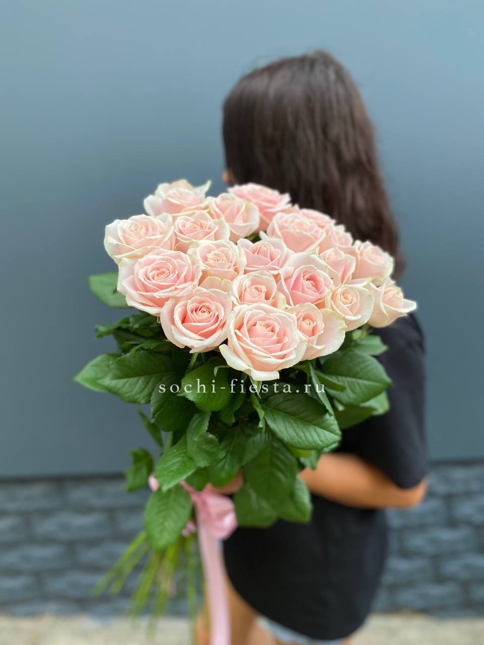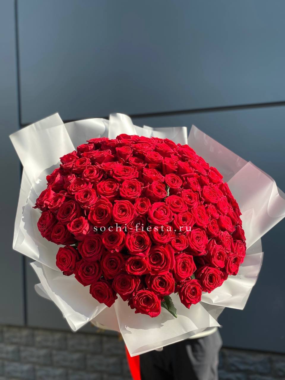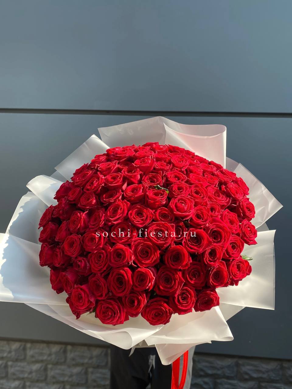 Двадцать пять стеблей выстроены в объёмную композицию с выразительным присутствием. Авторское оформление добавляет завершённость и подчёркивает масштаб букета.