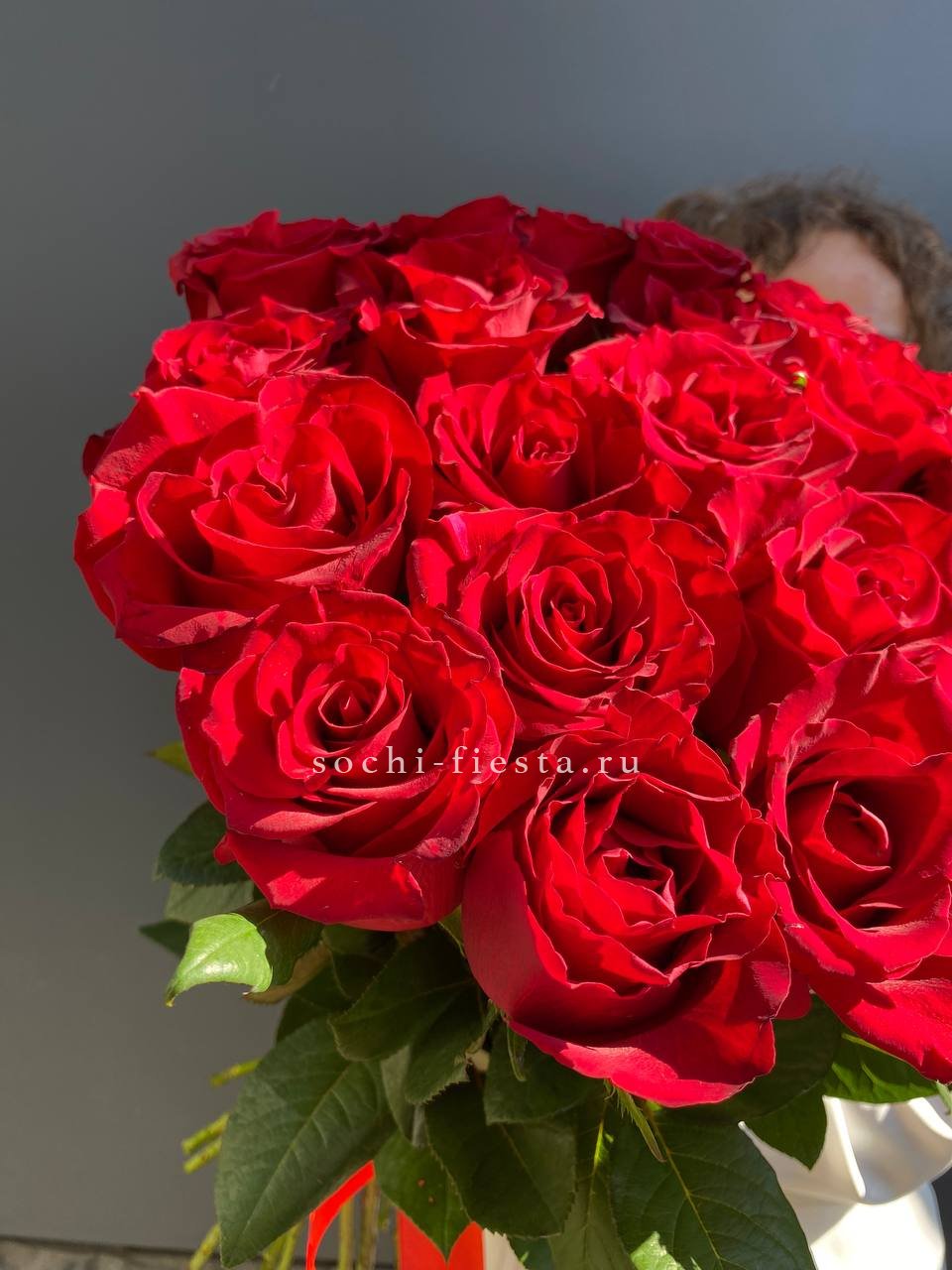 Двадцать пять красных роз с длинными стеблями держат форму и долго радуют свежестью. Классическая красная гамма звучит уверенно и ярко в любой обстановке.