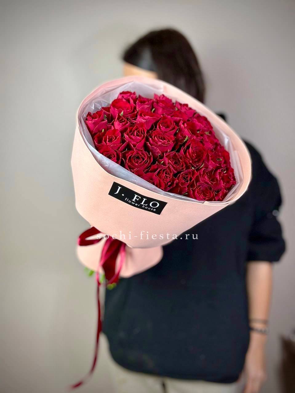 Двадцать семь бутонов плотно собраны в круглой коробке и создают объёмную цветочную шапку. Кенийские розы держат форму долго и раскрываются постепенно.