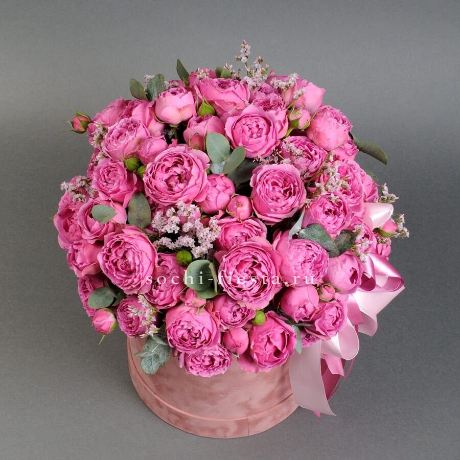 Пятнадцать пионовидных роз дополнены воздушным ковылём в минималистичном оформлении. Текстура густомахровых бутонов раскрывается слоями кремово-розовых лепестков с бежевым отливом.