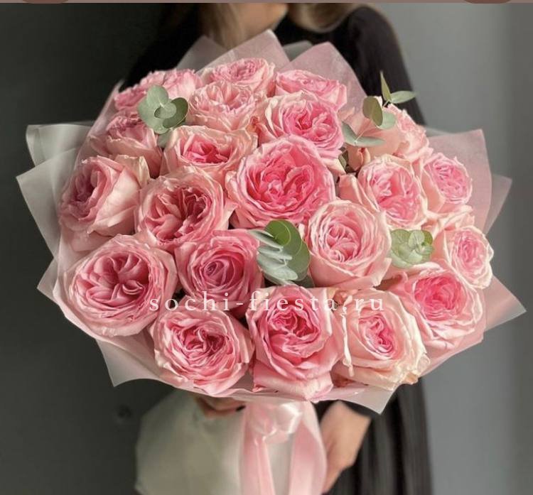 розы пионовидные 21шт, эвкалипт, пленка, лента.