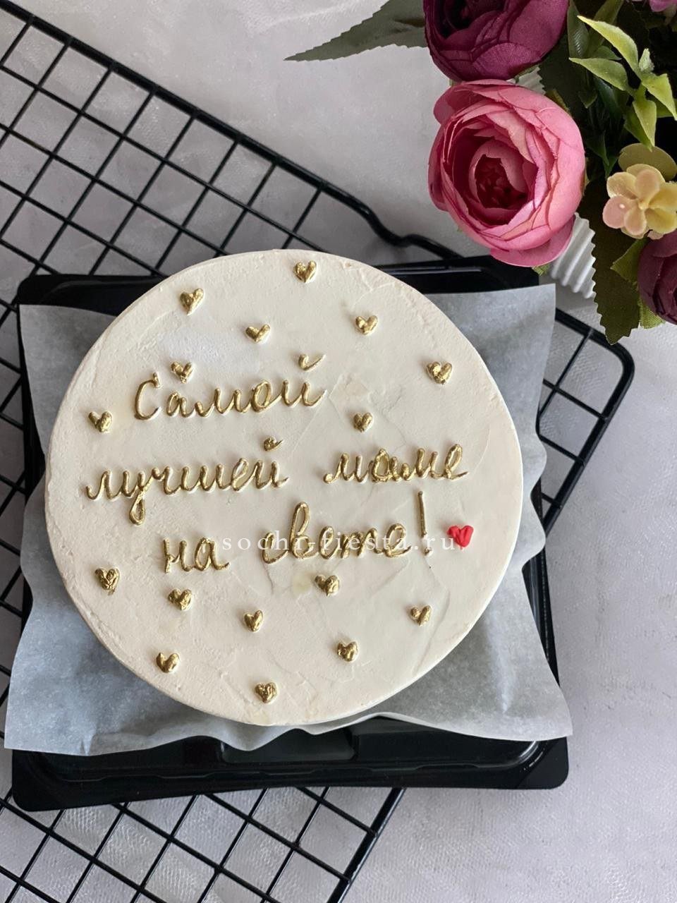Миниатюрный торт с яркой надписью и домашним теплом в каждом слое. Крем держит форму, а бисквит остается влажным благодаря небольшому объему и свежести выпечки.