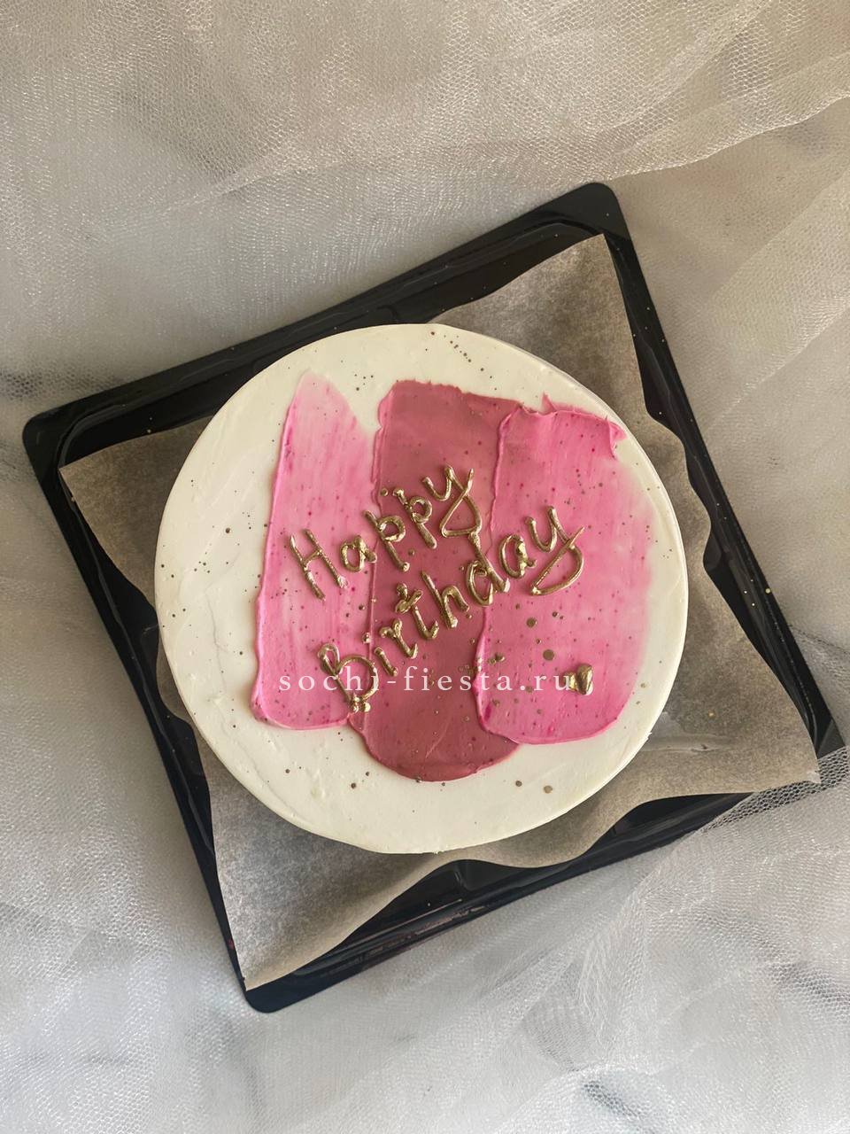 Дизайнерский бенто-торт ручной работы с поздравительной надписью и готовым декором. Формат удобен для камерного чаепития или как дополнение к основному подарку.