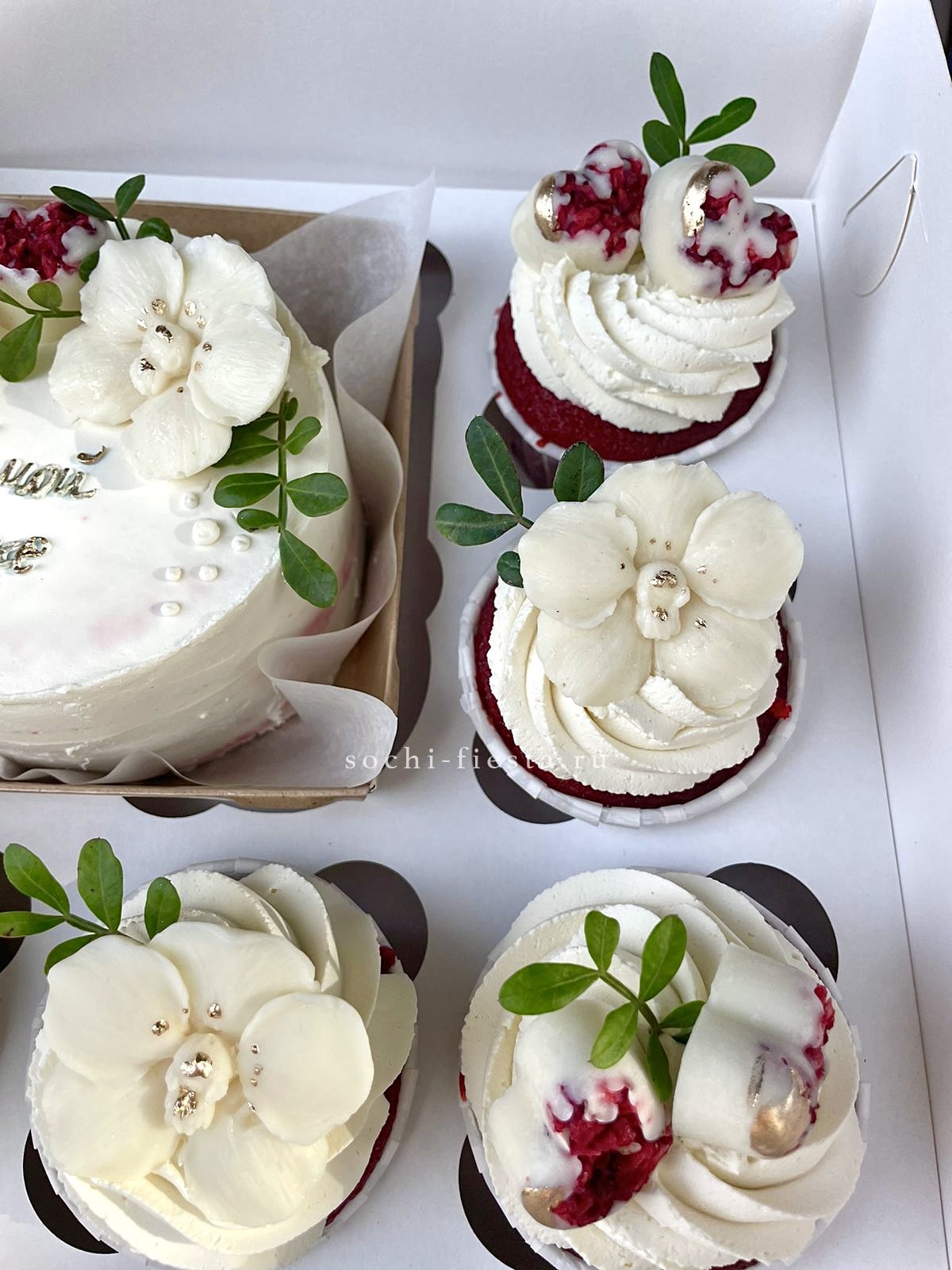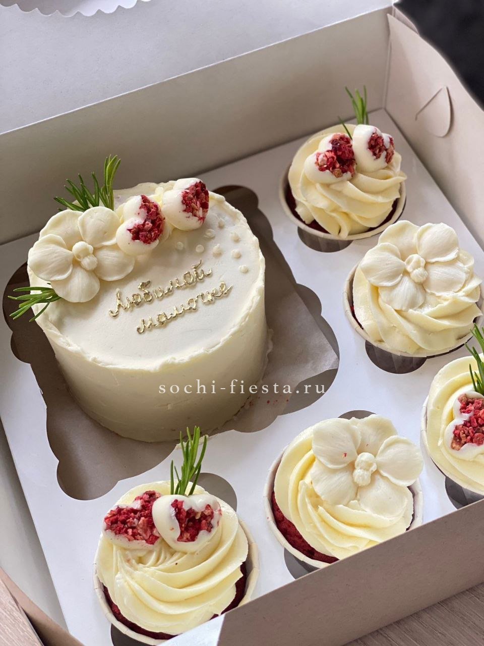 Набор из пяти капкейков и бенто-торта с декором из бельгийского шоколада и сушеных ягод. Четыре варианта начинок от красного бархата до ванили с ягодами. Фисташковая зелень добавляет свежести композиции.